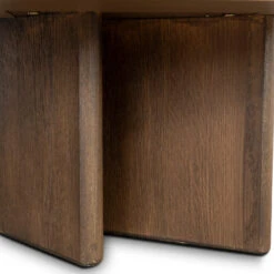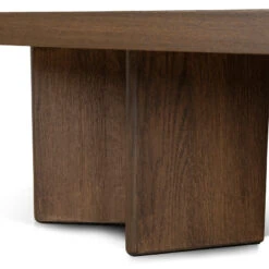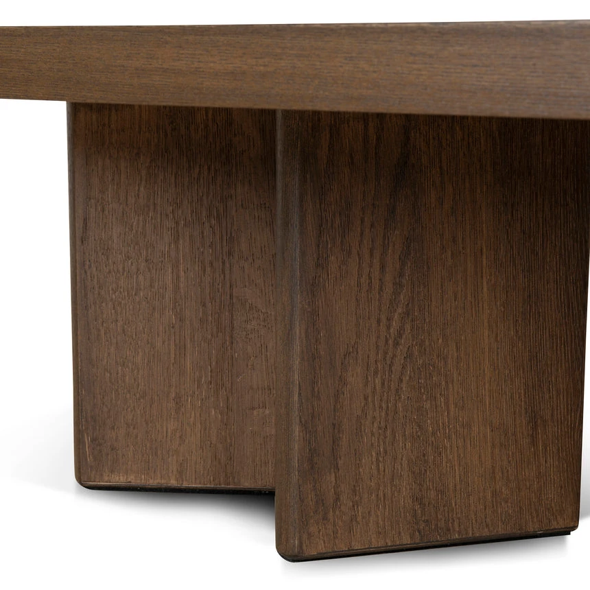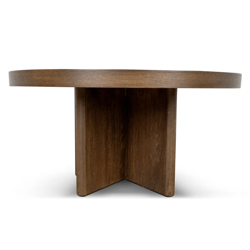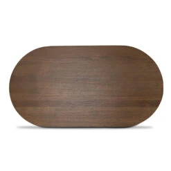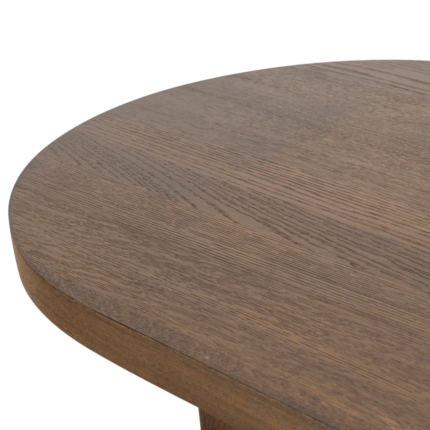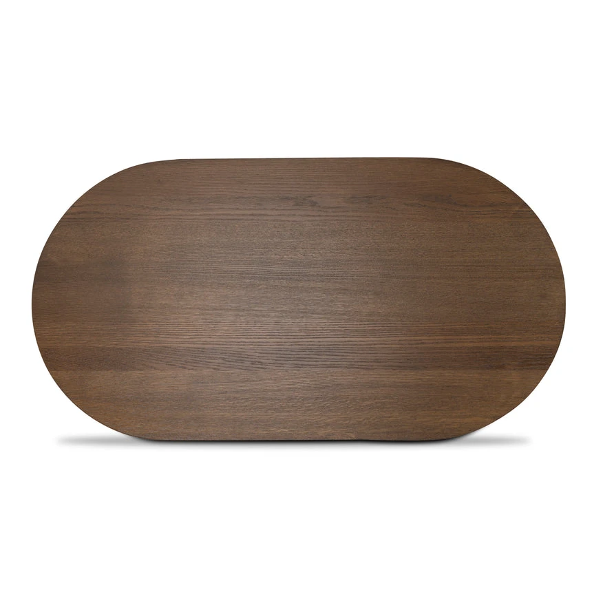 Engineered wood with oak veneer construction Caramel oak finish Oval tabletop Open triangular legs Modern geometric design Product comes fully assembled