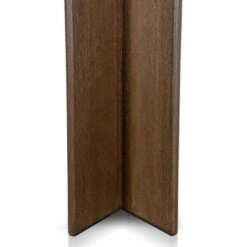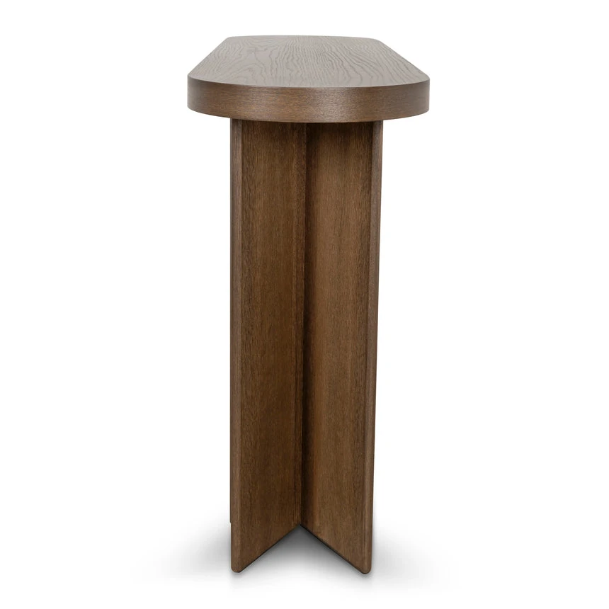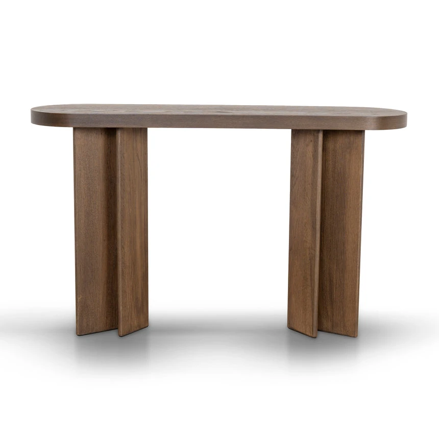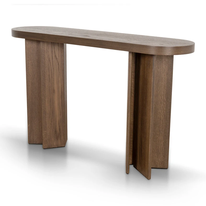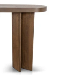 Engineered wood with oak veneer construction Caramel oak finish Oval tabletop Open triangular legs Modern geometric design Product comes fully assembled