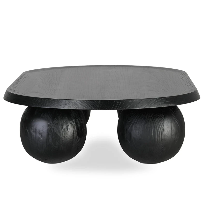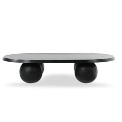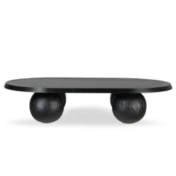 Solid recycled fir legs Solid elm frame with plywood oak veneer tabletop Elegant oval shape Sleek black color Four spherical legs Weight Capacity: 110 kg Requires minor assembly