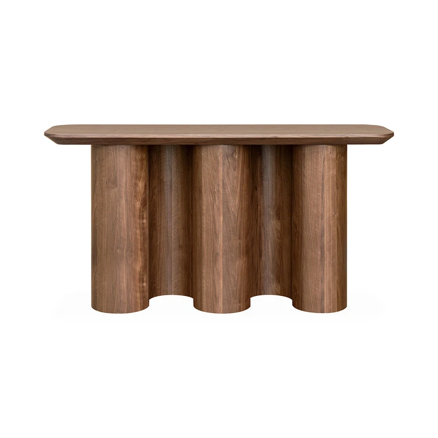 Engineered wood with walnut veneer Light walnut finish Interlinked arc-shaped base Rectangular top with softly curved edges Prominent wood grain patterns Modern design with unique appearance Product comes fully assembled