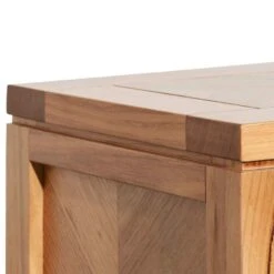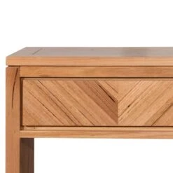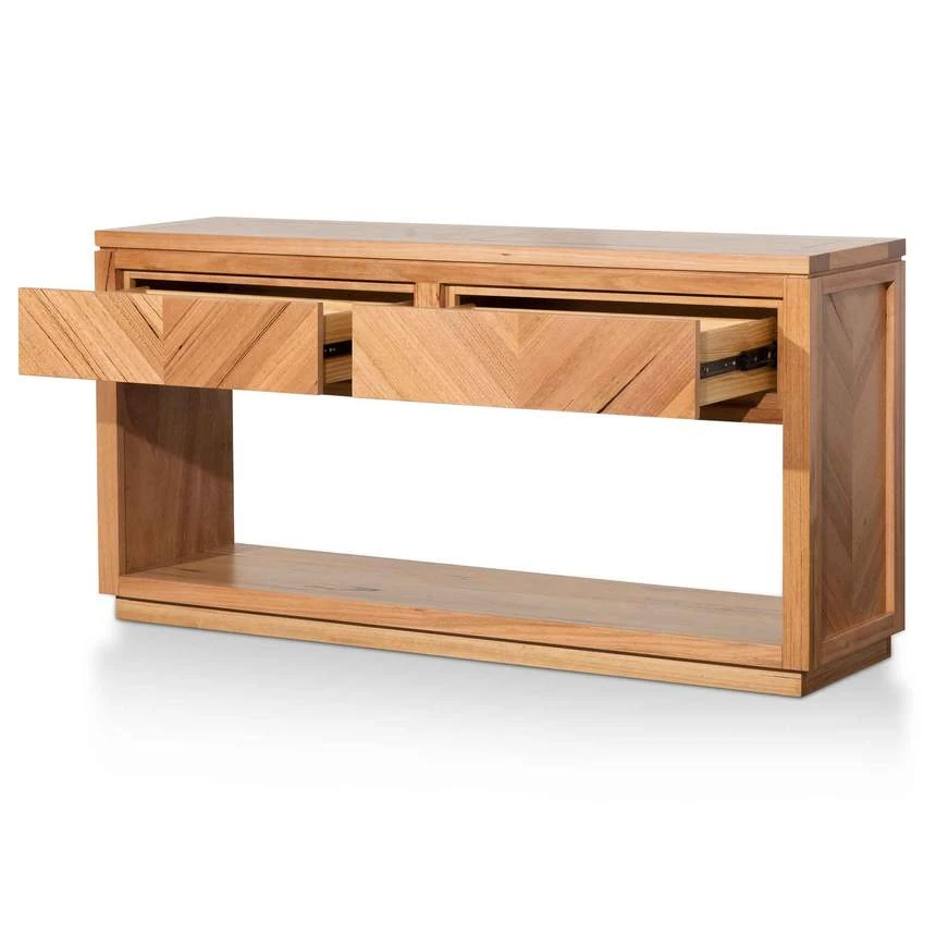 Messmate construction with solid wood front Complete all-natural finish with deep wood patterns throughout Chevron pattern and cut-out features showcase premium craftsmanship and character Mid-section boasting an open design allowing for storage or display options 2x drawers on metal rails Applicable for commercial use 1 year warranty Product is fully assembled