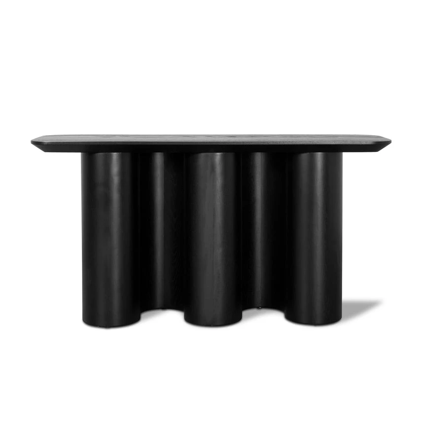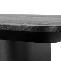 Engineered wood with walnut veneer Textured Espresso Black finish Interlinked arc-shaped base Rectangular top with softly curved edges Prominent wood grain patterns Modern design with unique appearance Product comes fully assembled