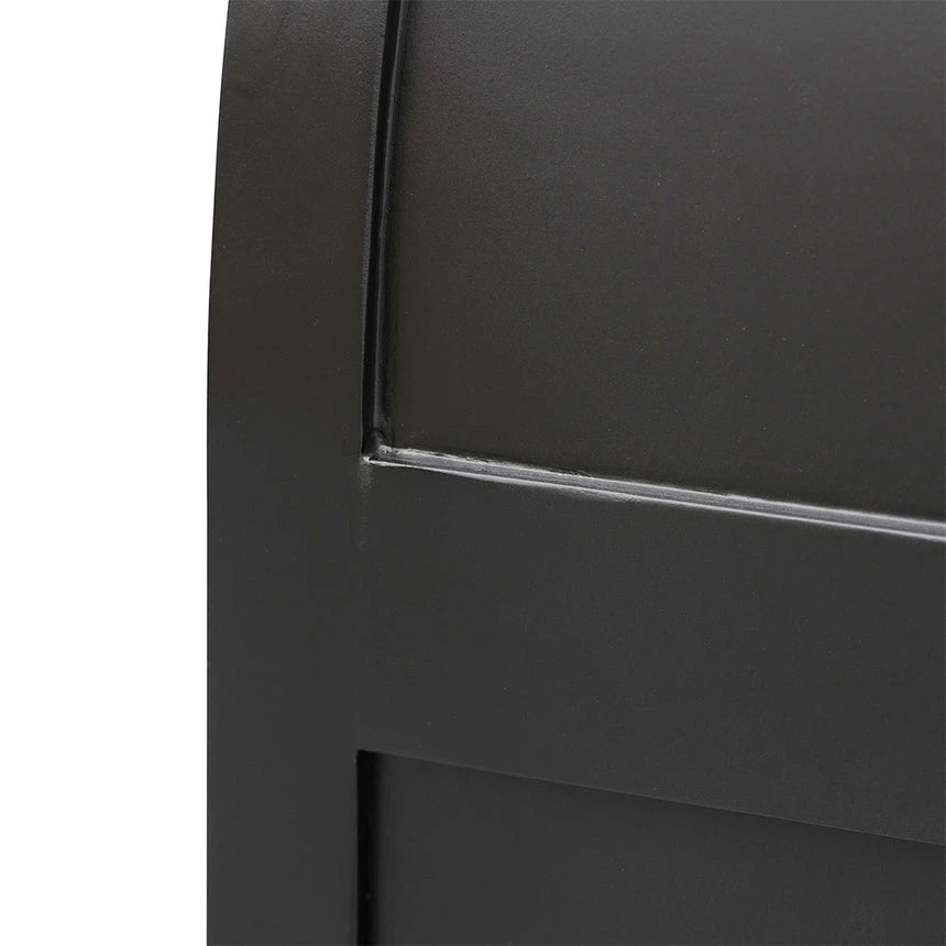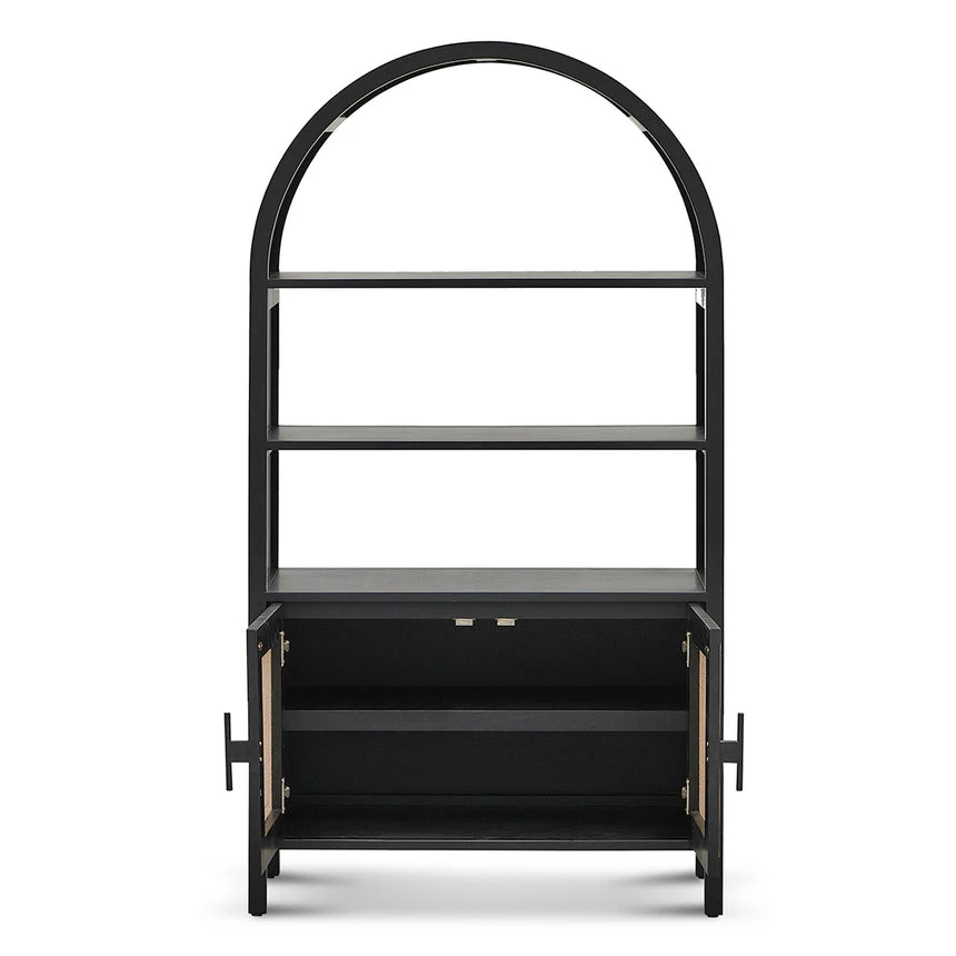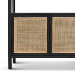 Solid poplar wood frame and legs Plywood veneer shelves 2 internal storage shelves 2 top open shelves Handwoven rattan doors and magnetic latch Black matte handles Weight Capacity: Top 100 kg, Shelves 20 kg Product comes fully assembled
