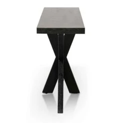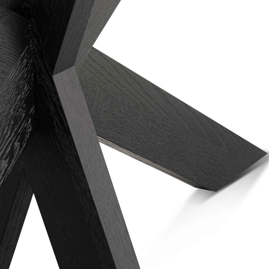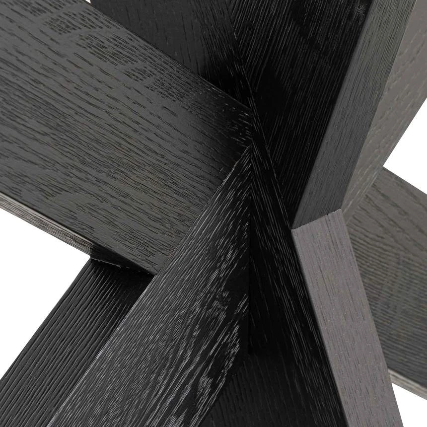 Engineered wood with black oak veneer construction X-cross base with contrasting linear tabletop Textured espresso black finish showcasing natural wood textures throughout Product requires assembly