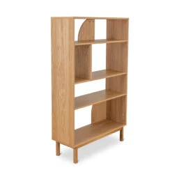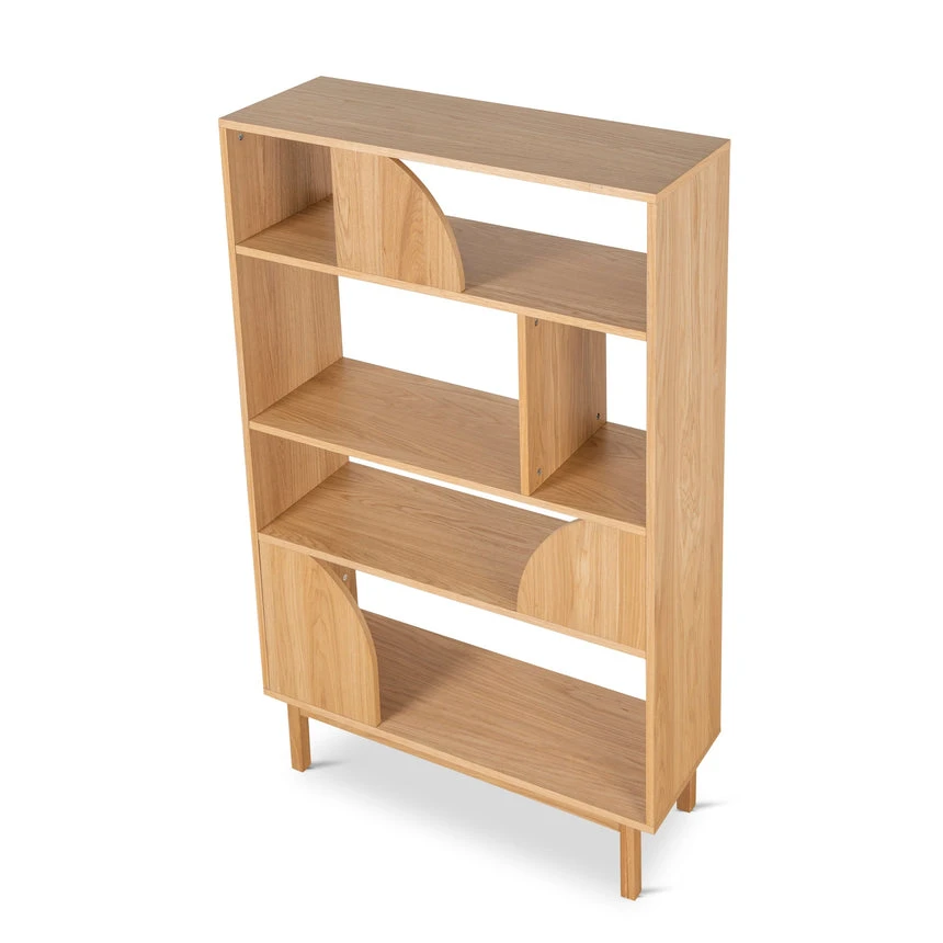 This multi-purpose book shelf is the perfect addition to any home. Made with high-quality engineered wood and oak veneer, it is both durable and stylish. The solid oak wood legs provide a sturdy base, while the semi-circular cutout design adds a touch of elegance. The open shelving allows for an airy and spacious feel, making it perfect for displaying books, decor, or other items.