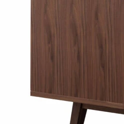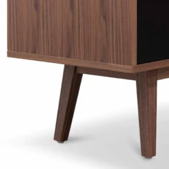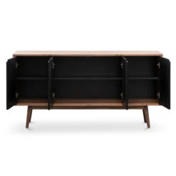 Engineered wood and walnut veneer construction Doors in an engineered wood build and matte black finish Legs in solid ash wood with a flared feature 4x doors with a cut-out handle design 6x concealed shelves with 2x varied cupboard sizing Minor assembly to attach legs to base Note: Due to the nature of timber and veneer, any variations of wood grain and colour are not inconsistencies and should be appreciated as a characteristic of the table. We recommend the use of placemats and/or coasters to protect the product.