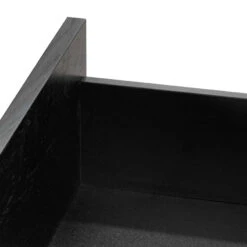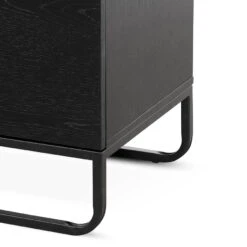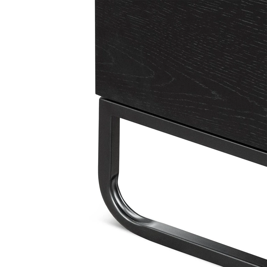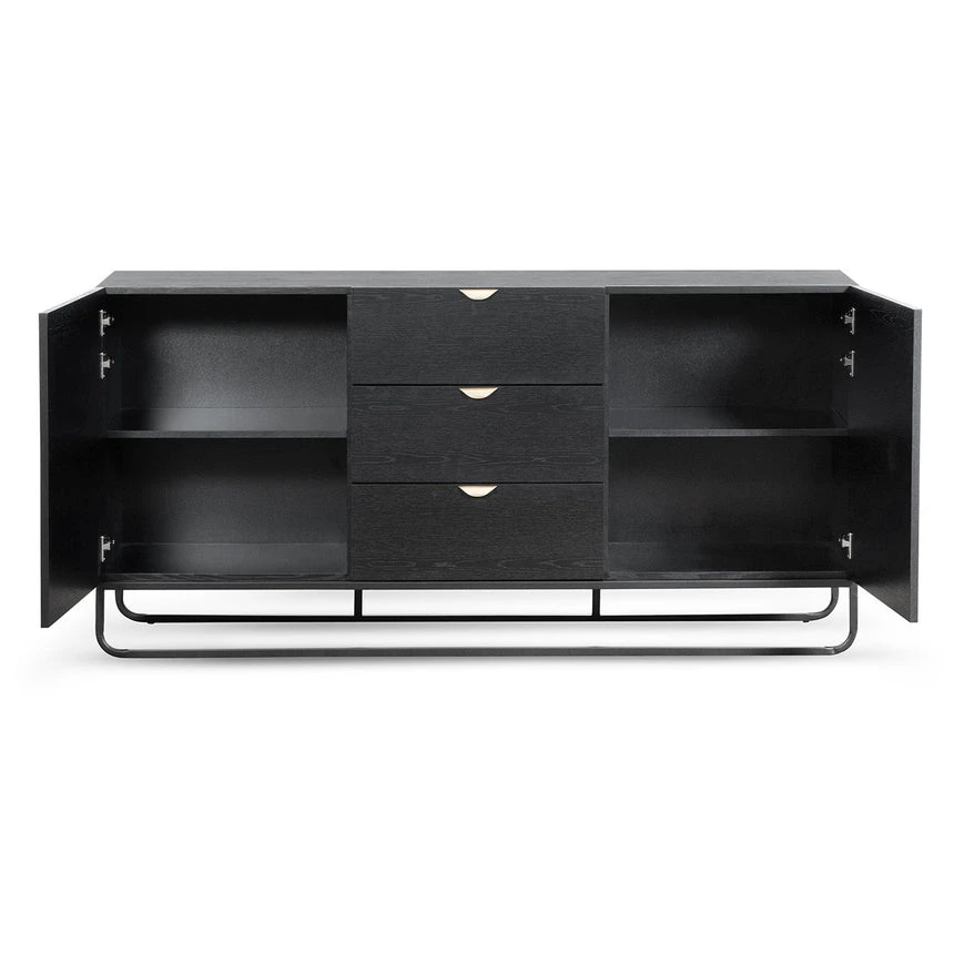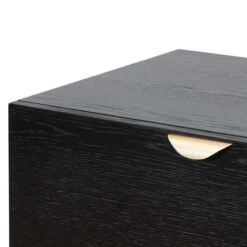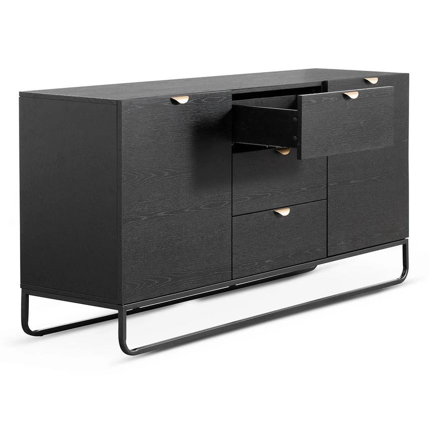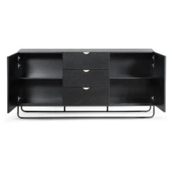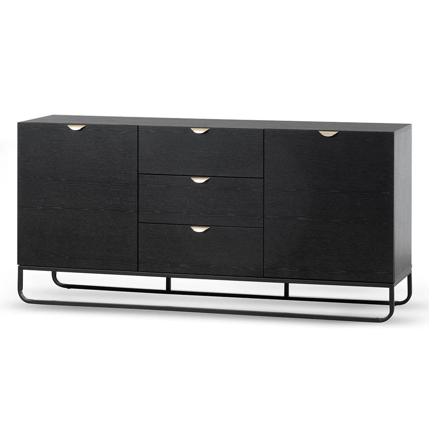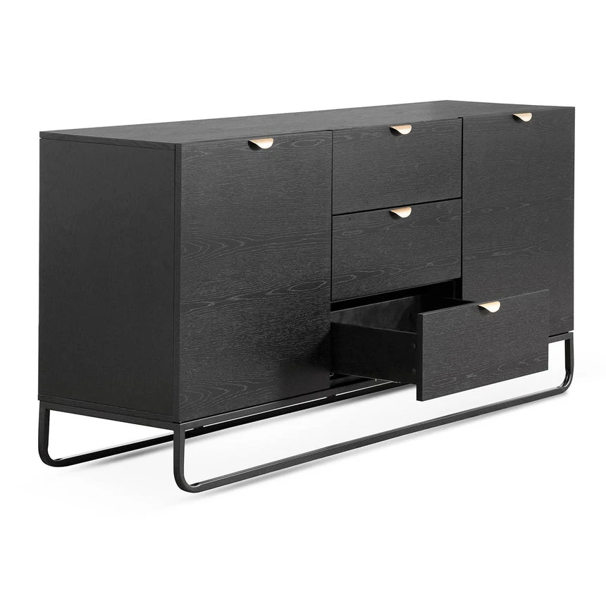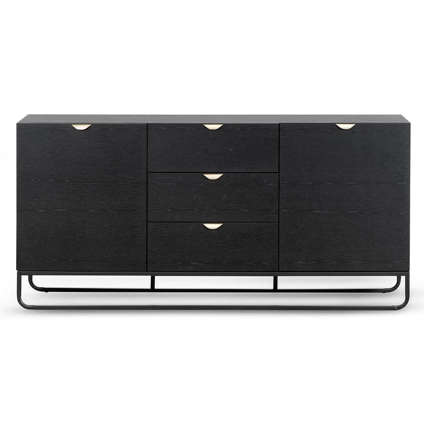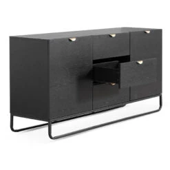 Engineered wood and black veneer construction Geometric matte black legs in a metal build Curved half-moon handles in brushed gold handles 3x pull-out drawers, 4x shelves and 2x doors Minor assembly required to attach legs to base