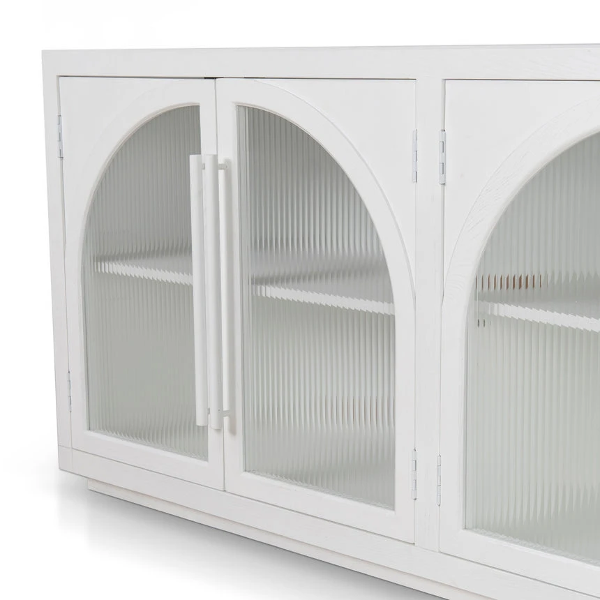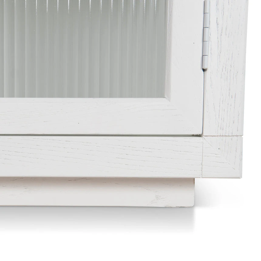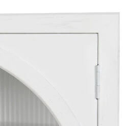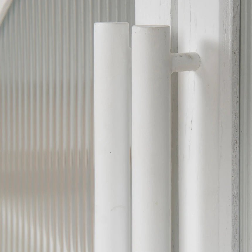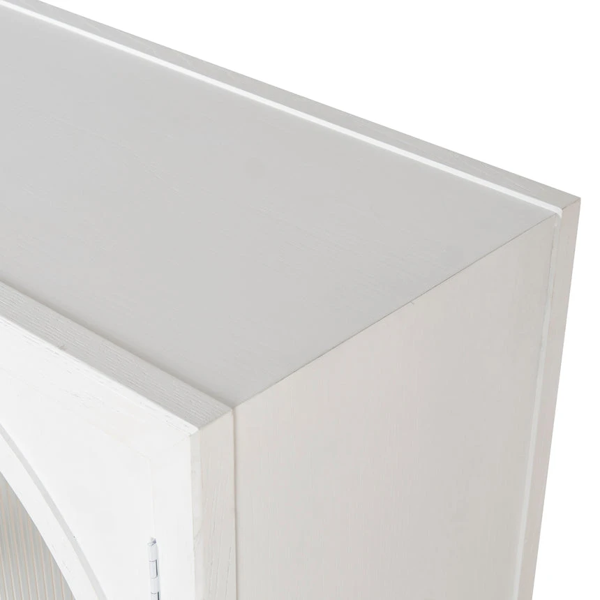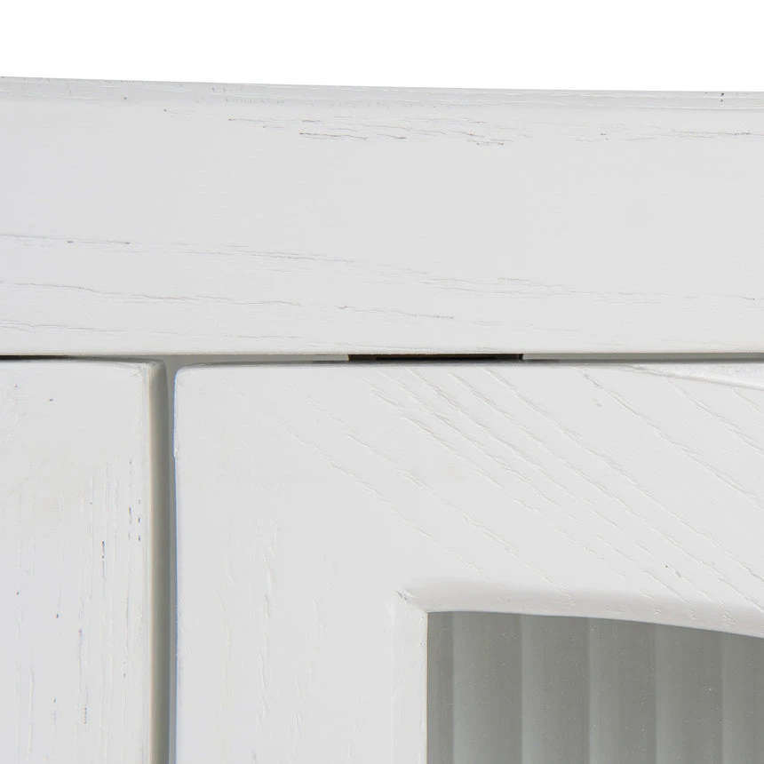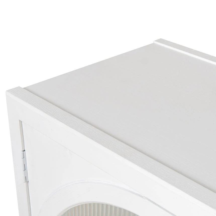 Solid oak frame Tempered glass doors Plywood veneer White finish with oiled base color Arched doors with fluted glass panels Sleek white handles Two spacious shelves with cable hole Weight capacity: Top 100 kg, Shelves 50 kg Product comes fully assembled