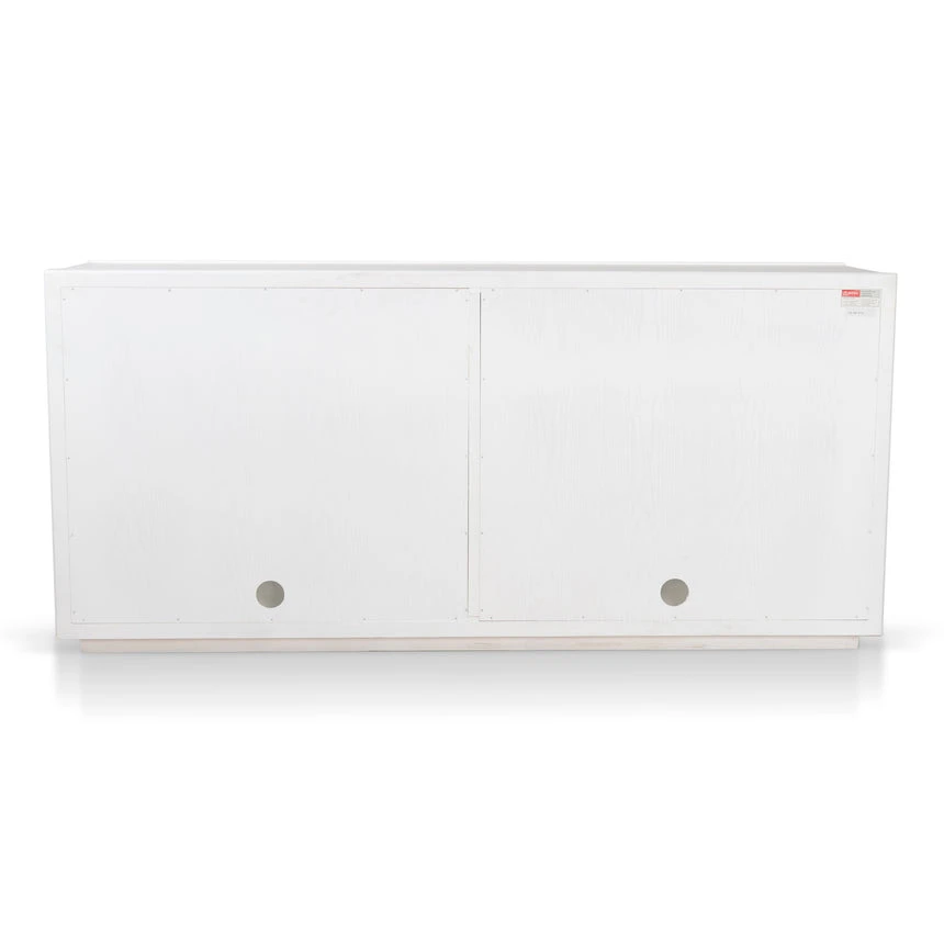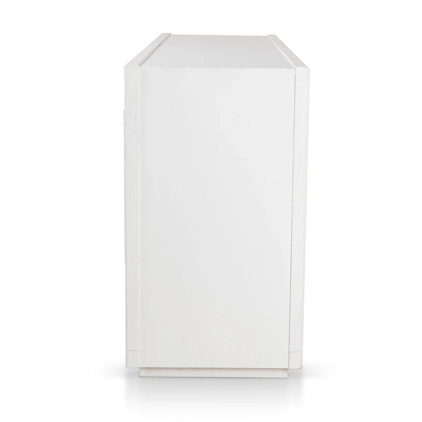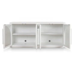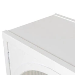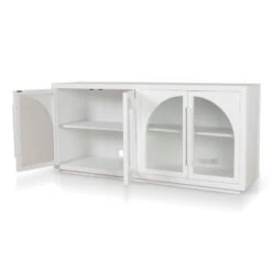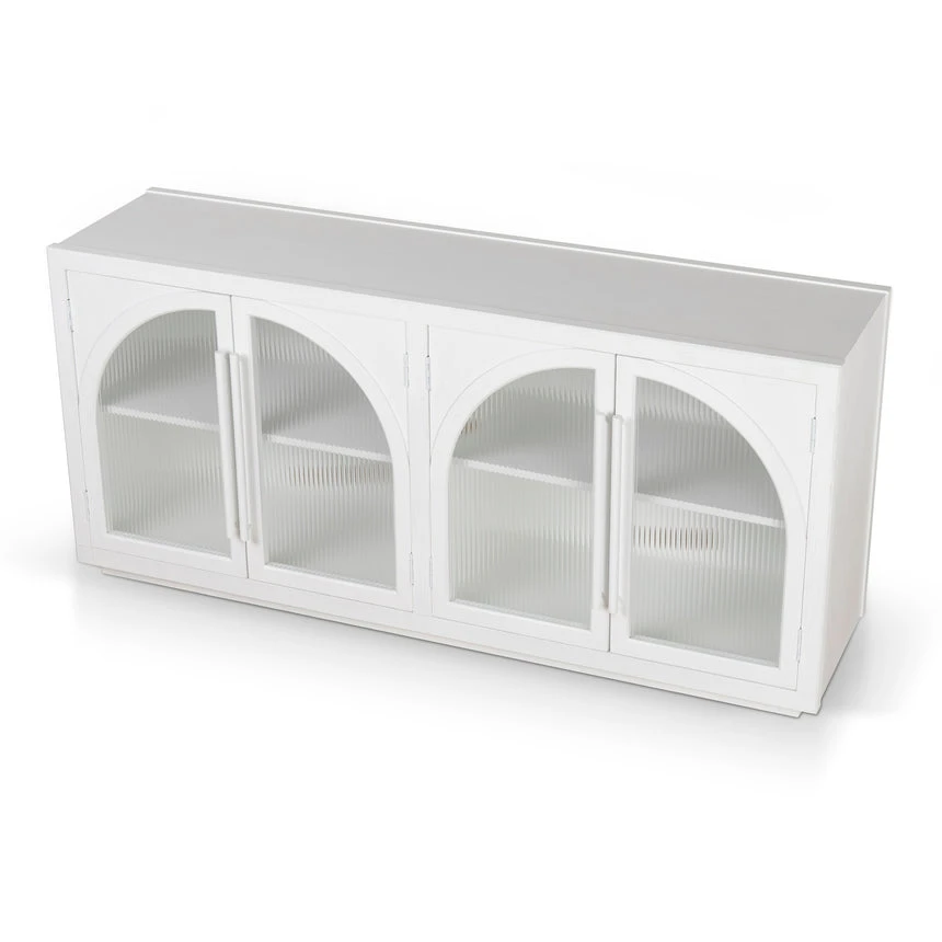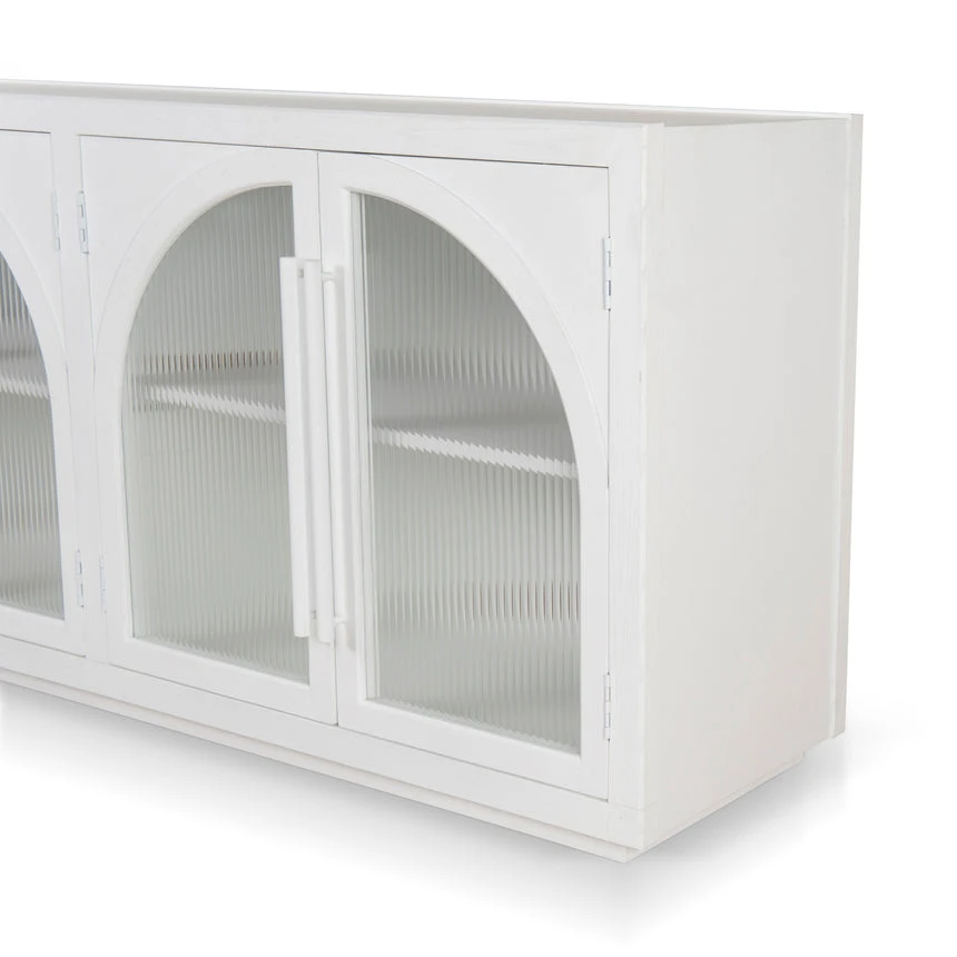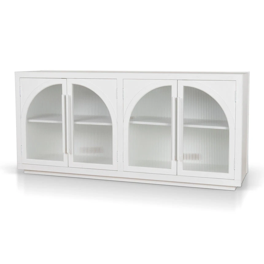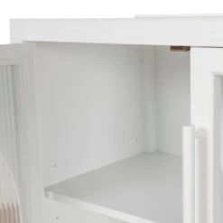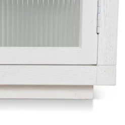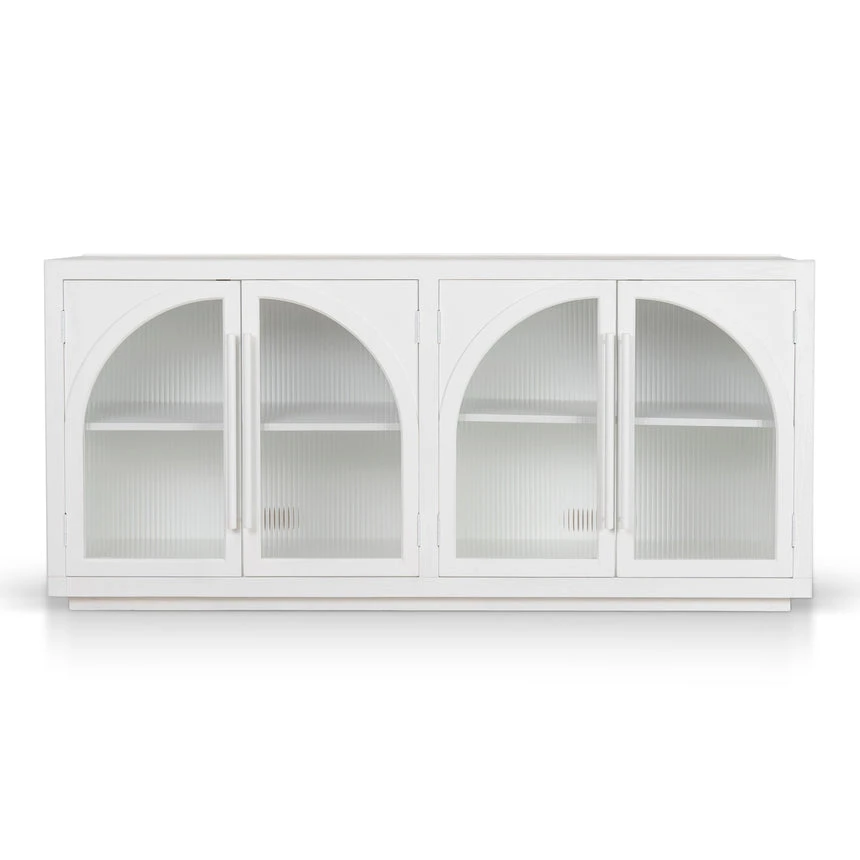 Solid oak frame Tempered glass doors Plywood veneer White finish with oiled base color Arched doors with fluted glass panels Sleek white handles Two spacious shelves with cable hole Weight capacity: Top 100 kg, Shelves 50 kg Product comes fully assembled