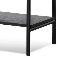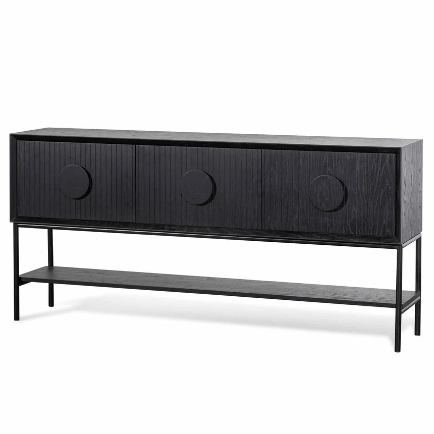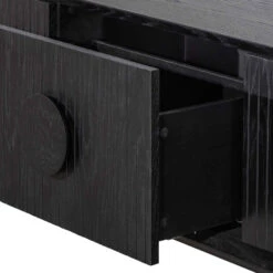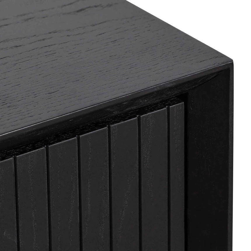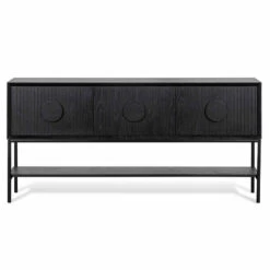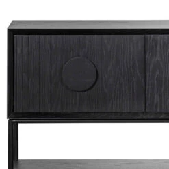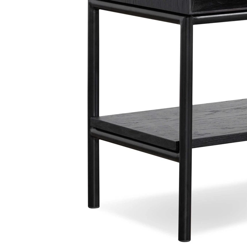 Durable engineered wood and black oak veneer construction Features E1 standard paneling Drawers with soft closing runner and metal [insert handle design] Frame and base in a sturdy metal build Rectangular design in a wide and generous size, with precise edges Body boasting deep wood textures and vertical wood slat detailing Features 3x drawers [to confirm] Minor assembly required to attach legs to base [to confirm]