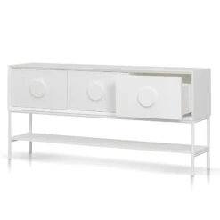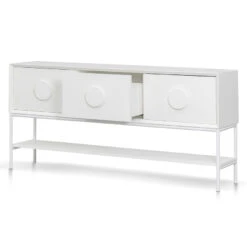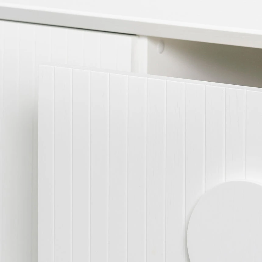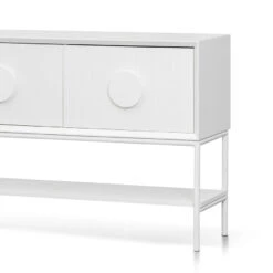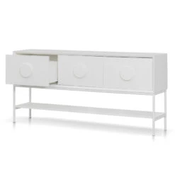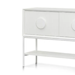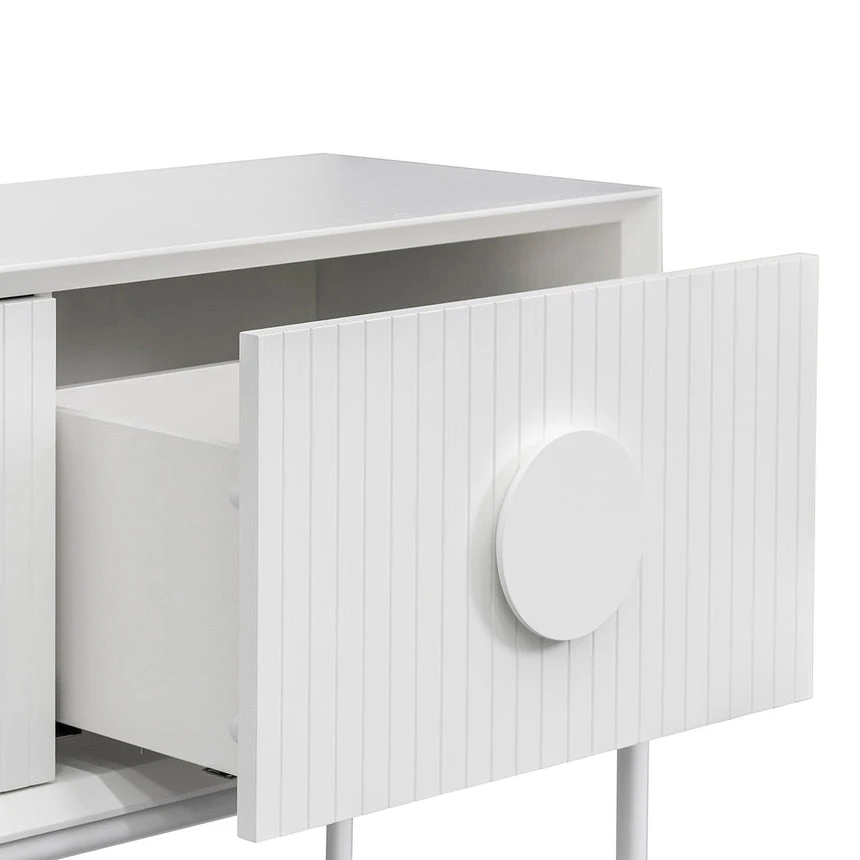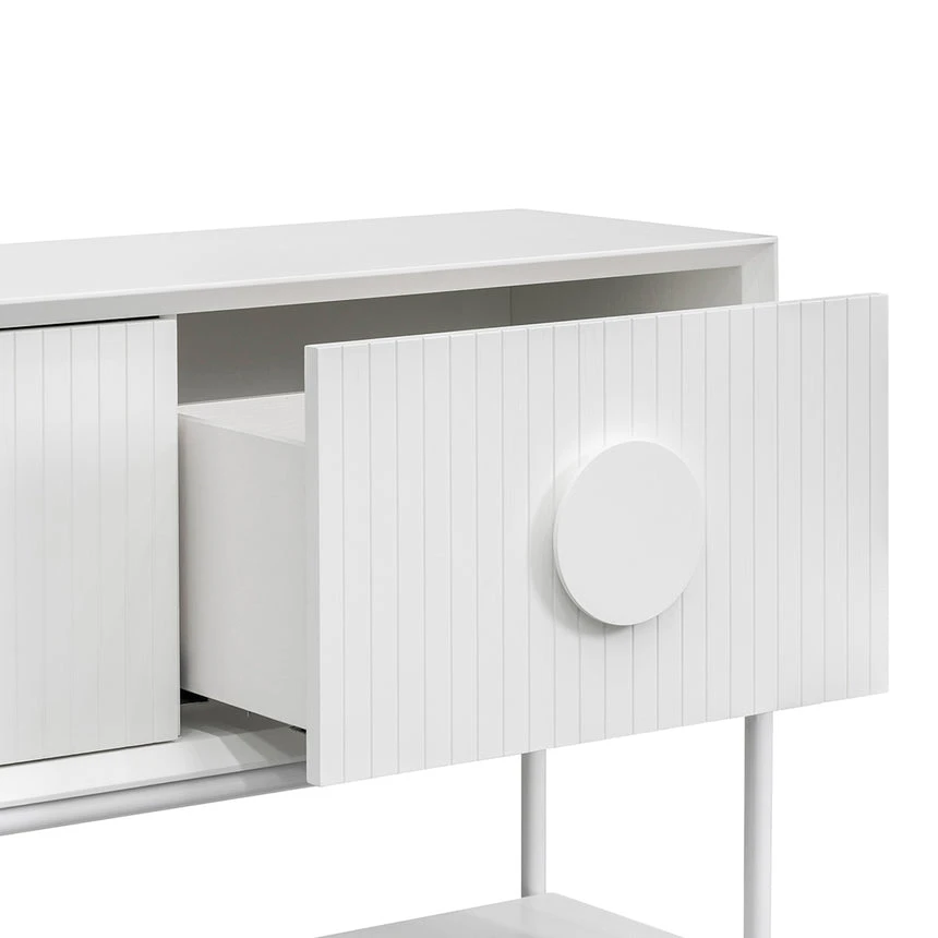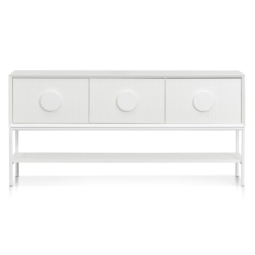 Engineered wood with White oak veneer White metal frame legs with attached bottom shelf 3x drawers with round wooden handle Soft closing rail for drawers 30kg weight limit on top and 5kg for drawer Minor Assembly required to attach legs to the unit