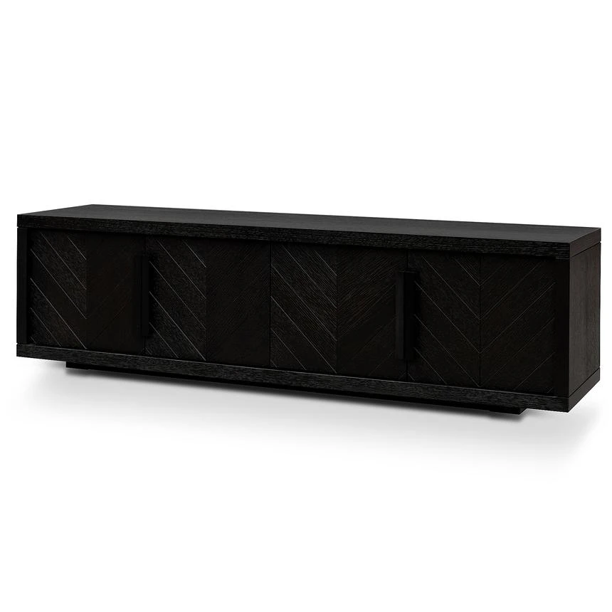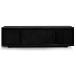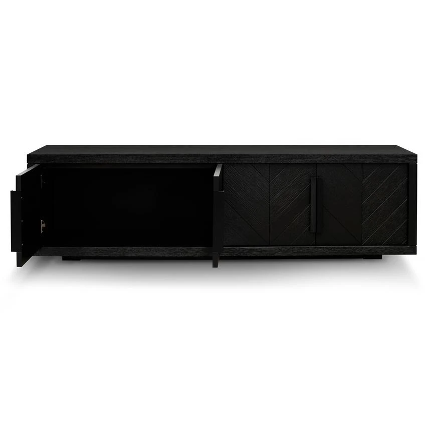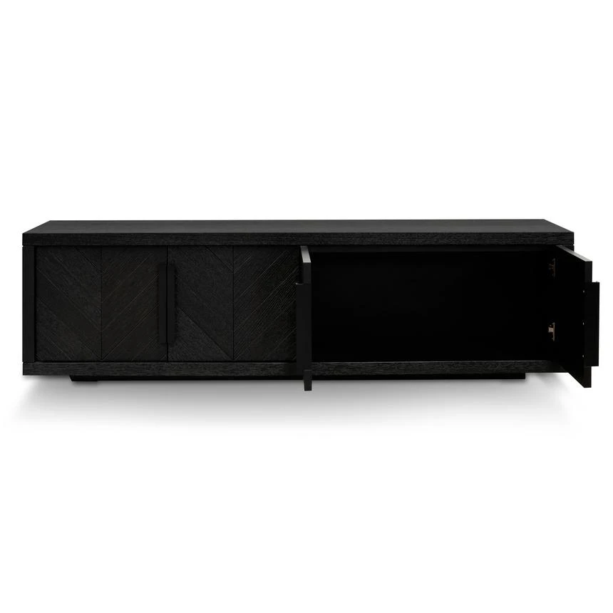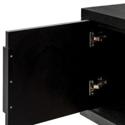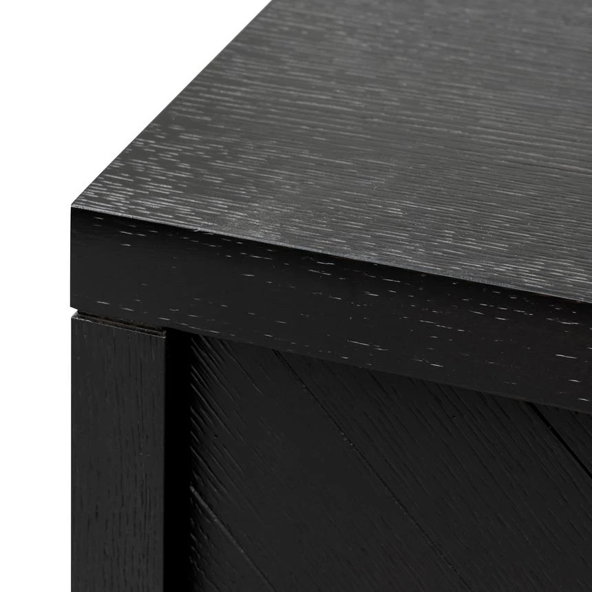 MDF with a black stained oak timber veneer finish 4 x cupboard doors with two compartments Matte black metal door handles Appliance hole included Fully assembled