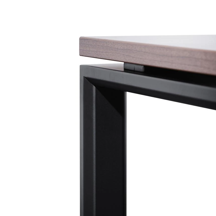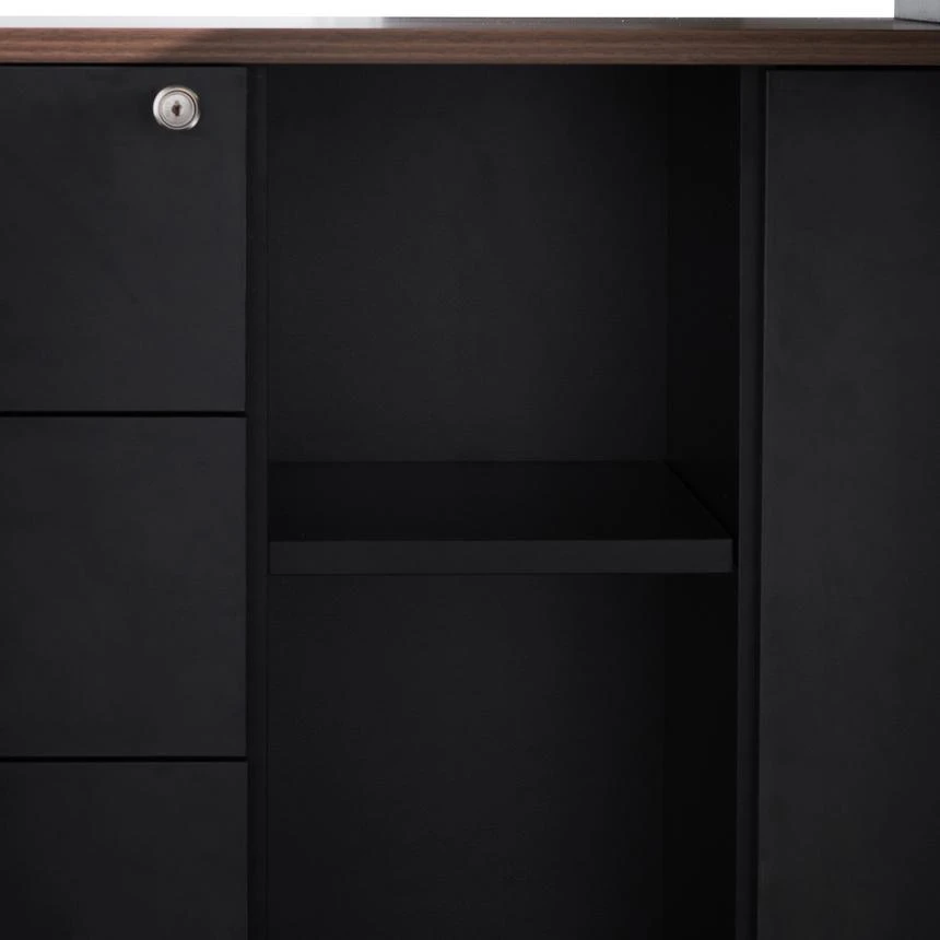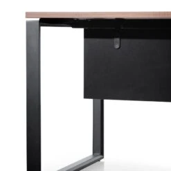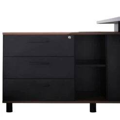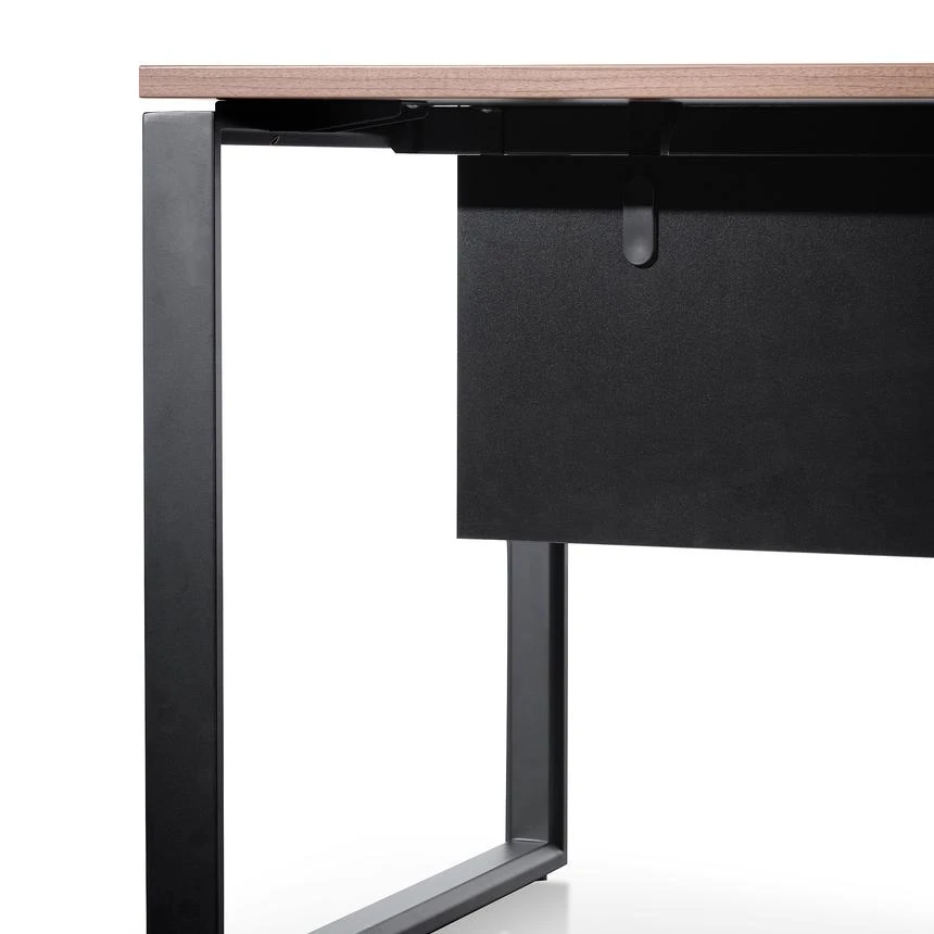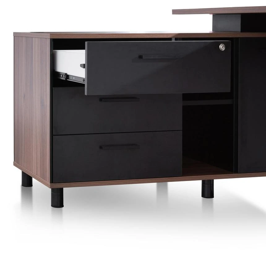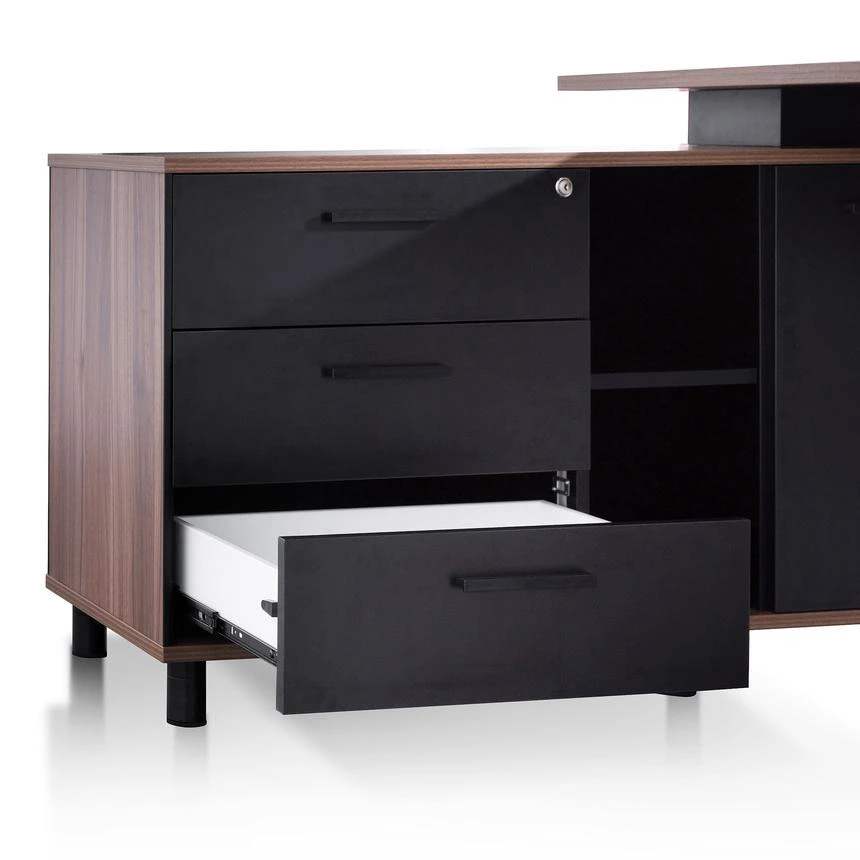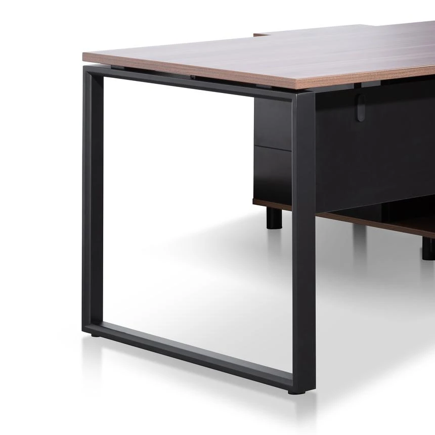 Table top in engineered wood with walnut oak veneer Metal legs finished in matte black Left return section and modesty panel in black Return section partially assembled for your convenience Removable modesty panel with storage locking included Return section with 3x drawers, 1x large storage compartment, and two-tier shelving 1x appliance port for easy cable management Commercial grade 5 year warranty Note : Approximate assembly duration of 45 minutes with two-man assembly, furniture assembly experience, and an electric drill required.
