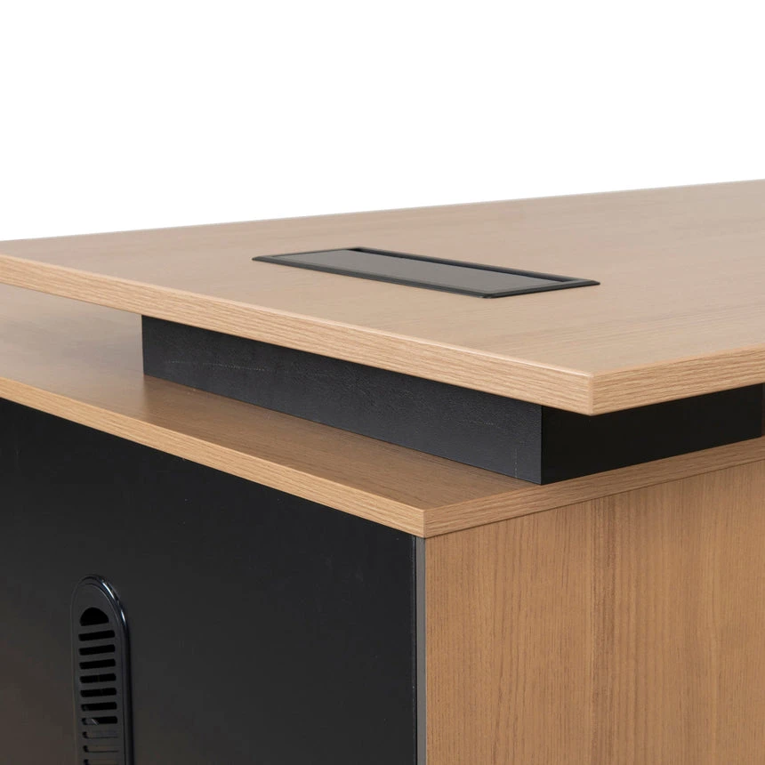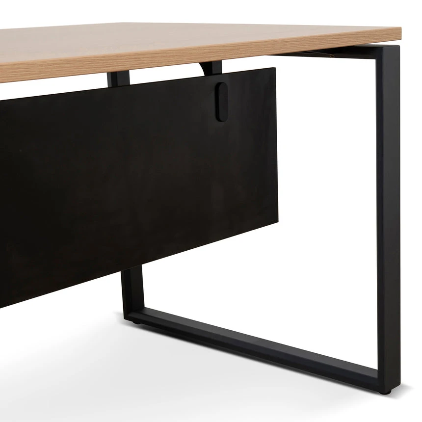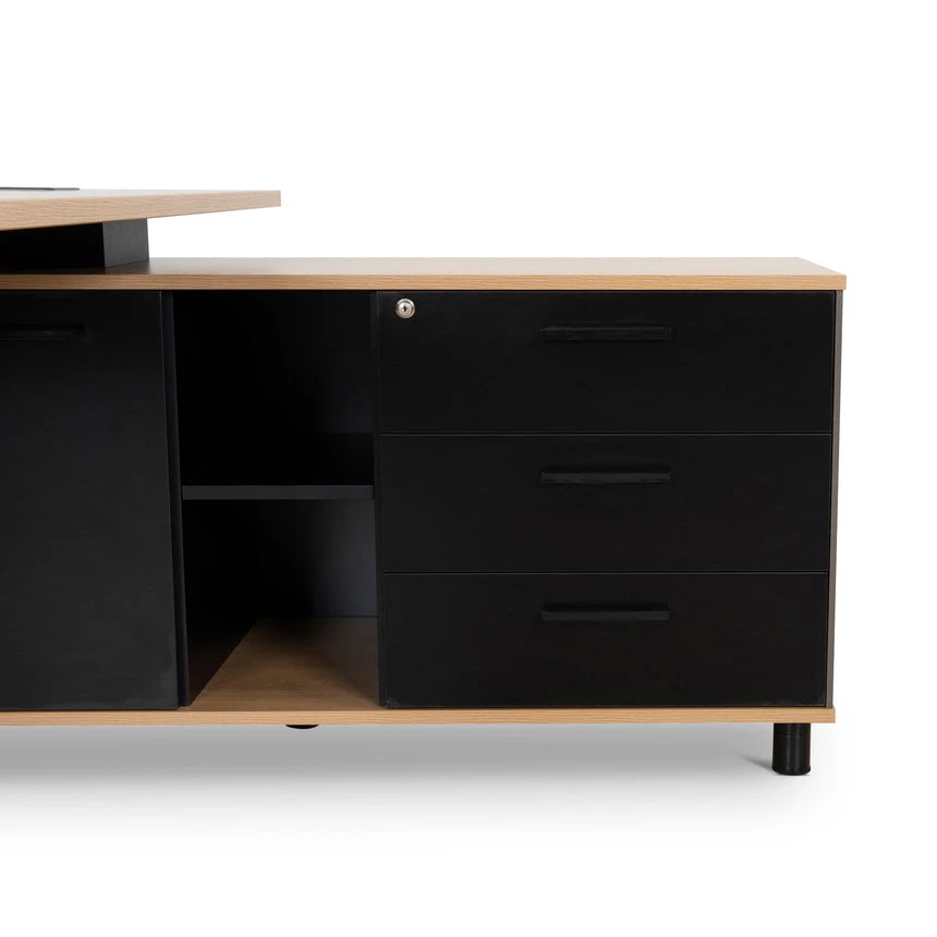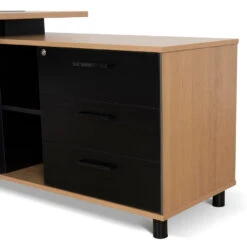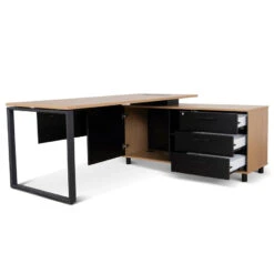 Metal frame Particle board tabletop and return Plastic legs PA plastic handles and cable box Right-facing return side Drawers and cabinet for organised storage Cable management slot Modern industrial design Weight Capacity: 200 kg Product is flat packed and requires two-person assembly