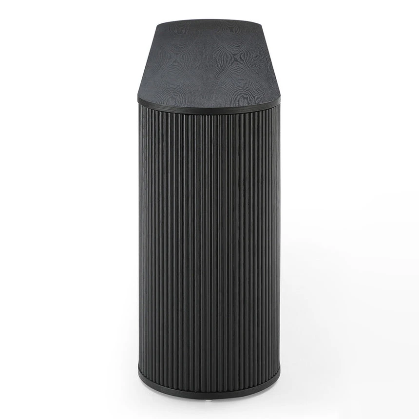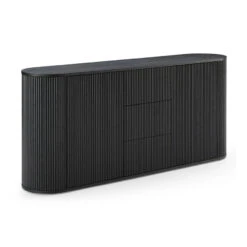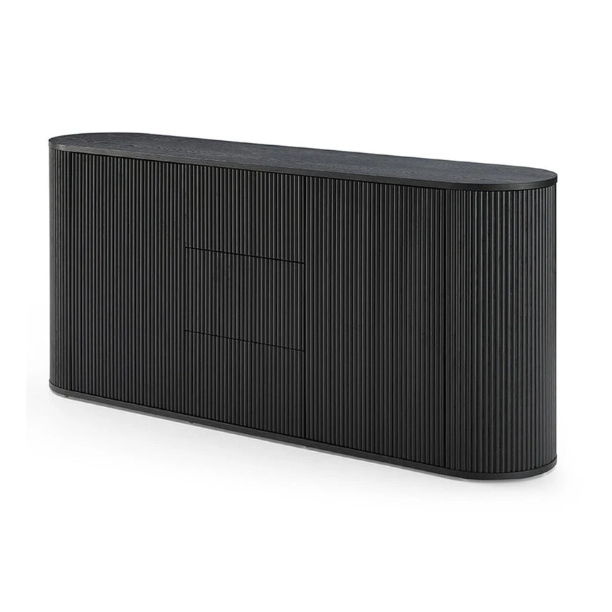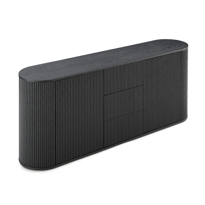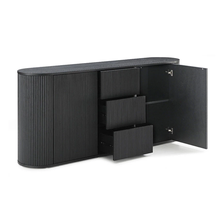 Durable engineered wood body with oak veneer finish 2 double-shelf cabinets on the side and 3 drawers in the middle Elegant design with vertical groves Softly curved ends, and handle-free push-open cabinets Black oak veneer finish Weight limit: 50kg on top and 5kg on every shelf Product requires two-person minor assembly to attach legs