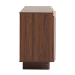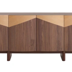 Engineered wood doors with walnut and oak veneers Melamine-coated particleboard top Engineered wood legs with walnut veneer finish Push soft-close mechanism Geometric pattern door design Sophisticated and elegant appearance Blend of warm walnut and oak veneers Weight Capacity: 100 kg Minor assembly required