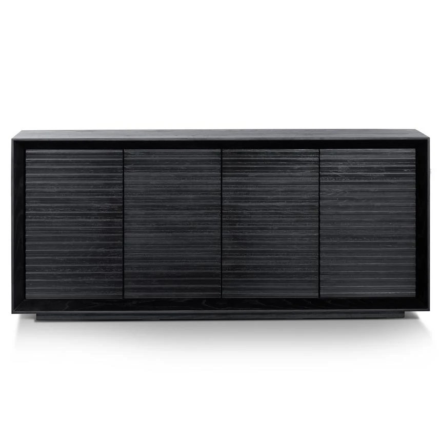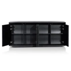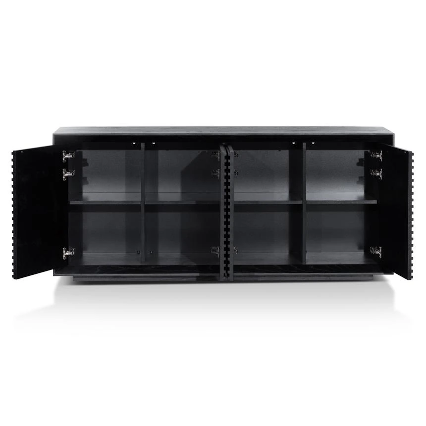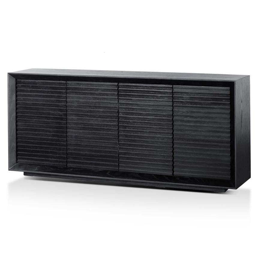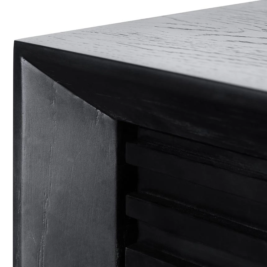 Durable oak veneer construction in black finish E1 standard paneling with short wooden base Doors in vertical wood slat design 4x push-to-open doors and 8x compartments Product is fully assembled