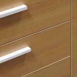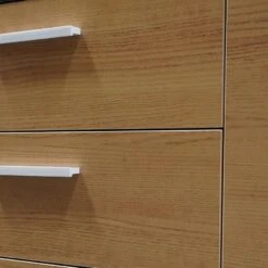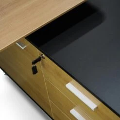 Right return section with 3x drawers, 1x large storage compartment, and 1x cupboard Melamine table top in a natural timber finish Polished chrome legs and steel base Flat white handles Removable black modesty panel Lockable drawers Commercial grade Note: 5- years manufacturer’s warranty against defects Commercial grade Two-person assembly required with furniture assembly experience and electical drill required