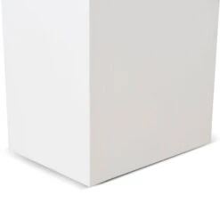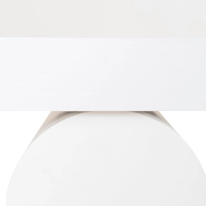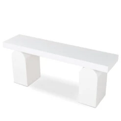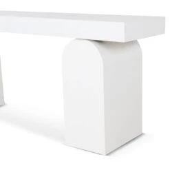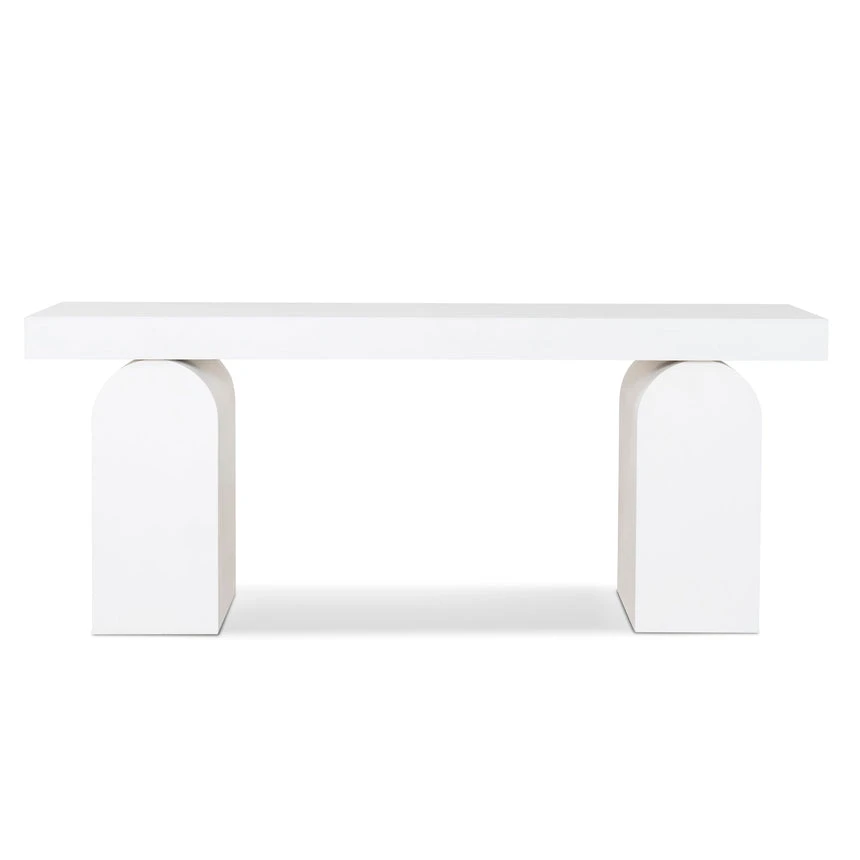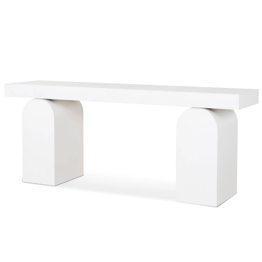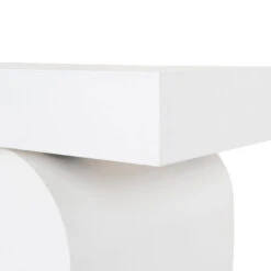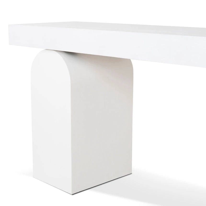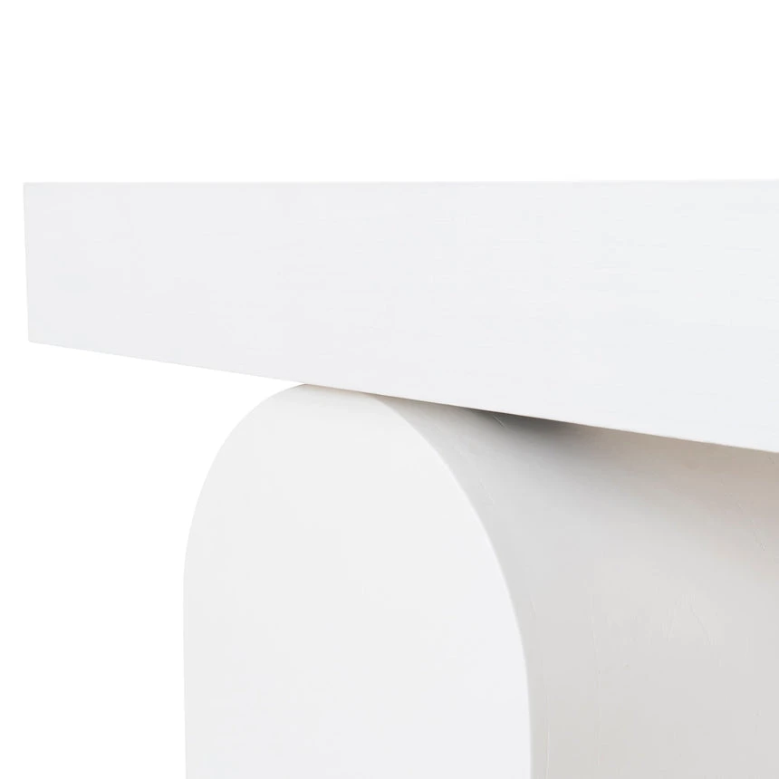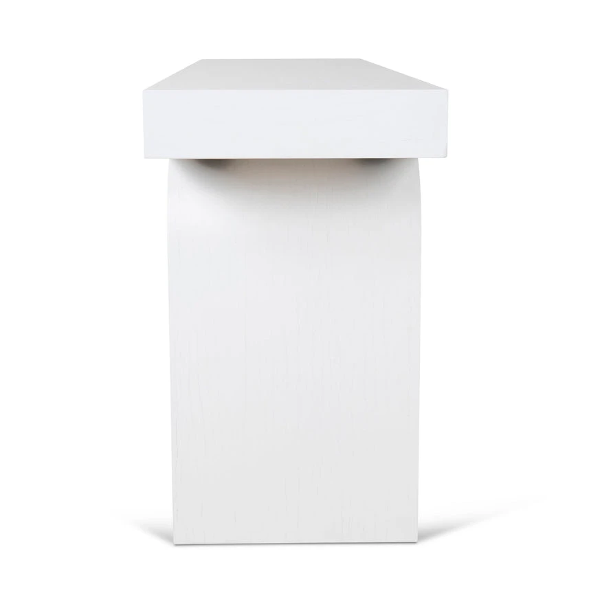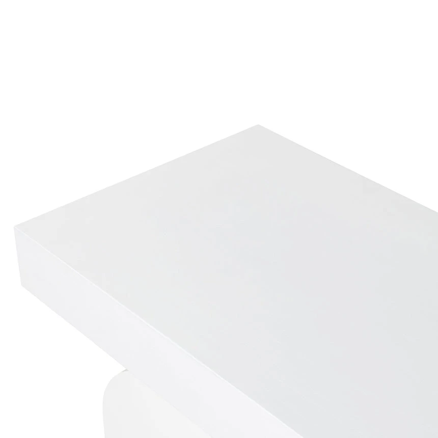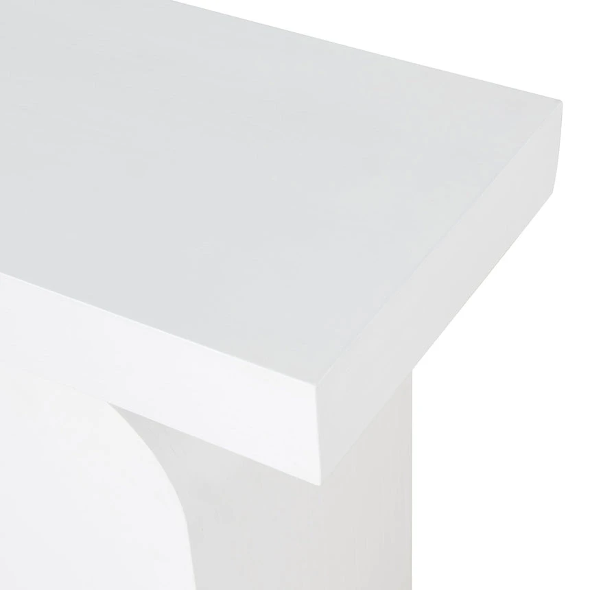 Deep elm veneer plywood construction Modern minimalist design Unique arched base Versatile all-white finish Spacious tabletop for display Weight Capacity: 150 kg Minor assembly required