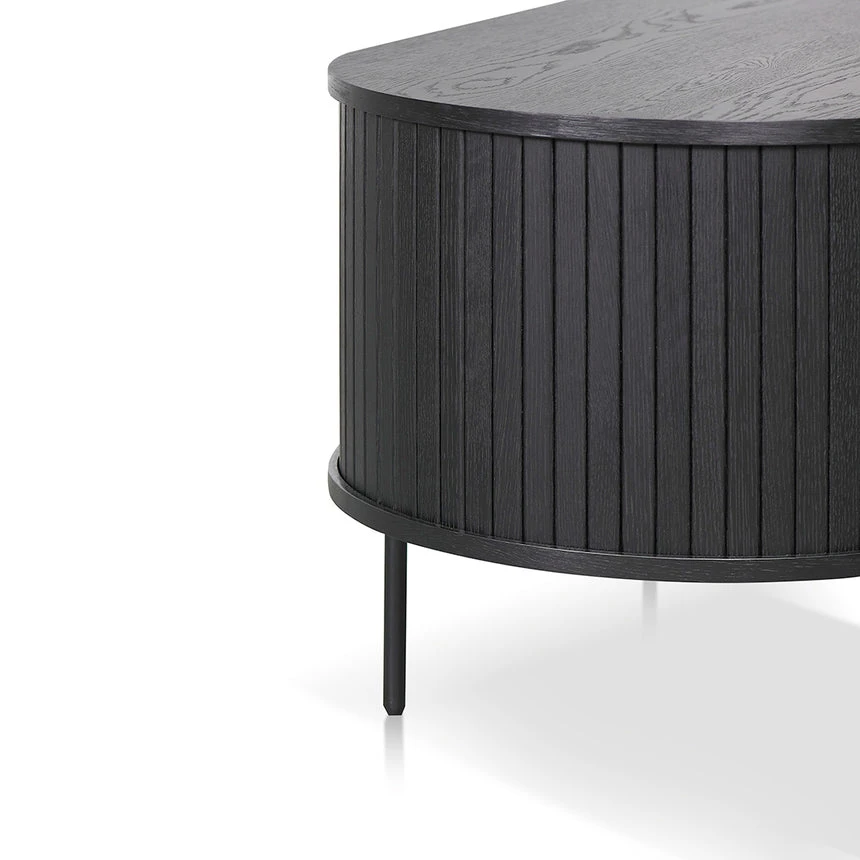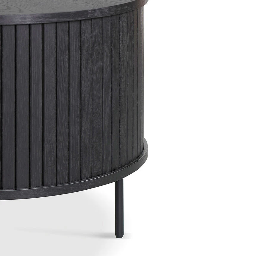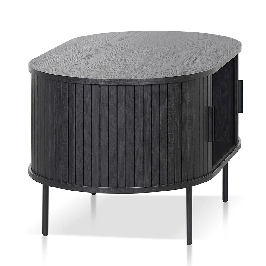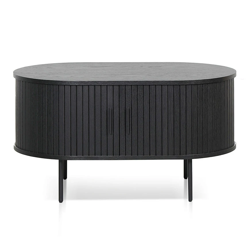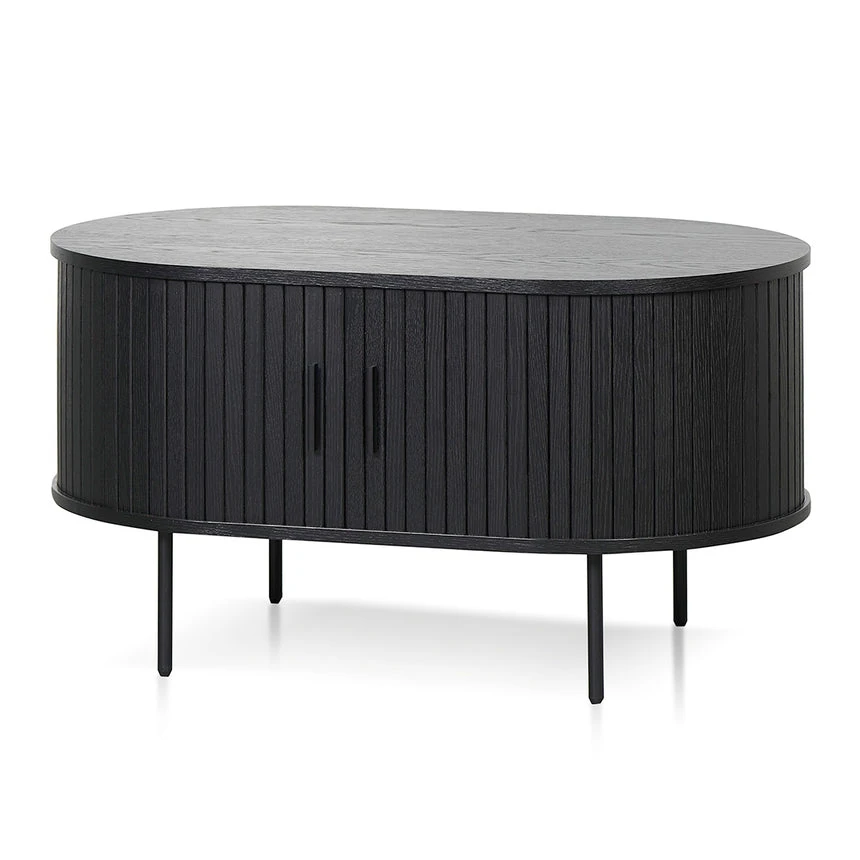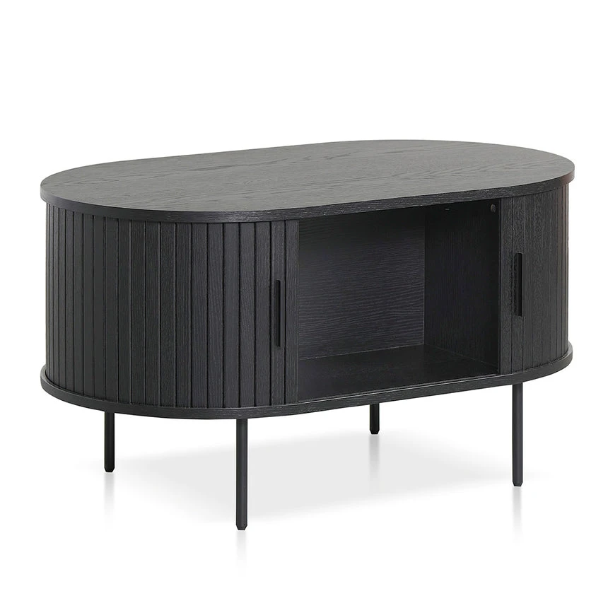 Engineered wood with veneer in black finish Sturdy black metal legs Lacquered finish Oval top with curved edges Side sliding doors with matte black handle Weight Capacity: 80 kg Product is flat packed and requires two-person assembly