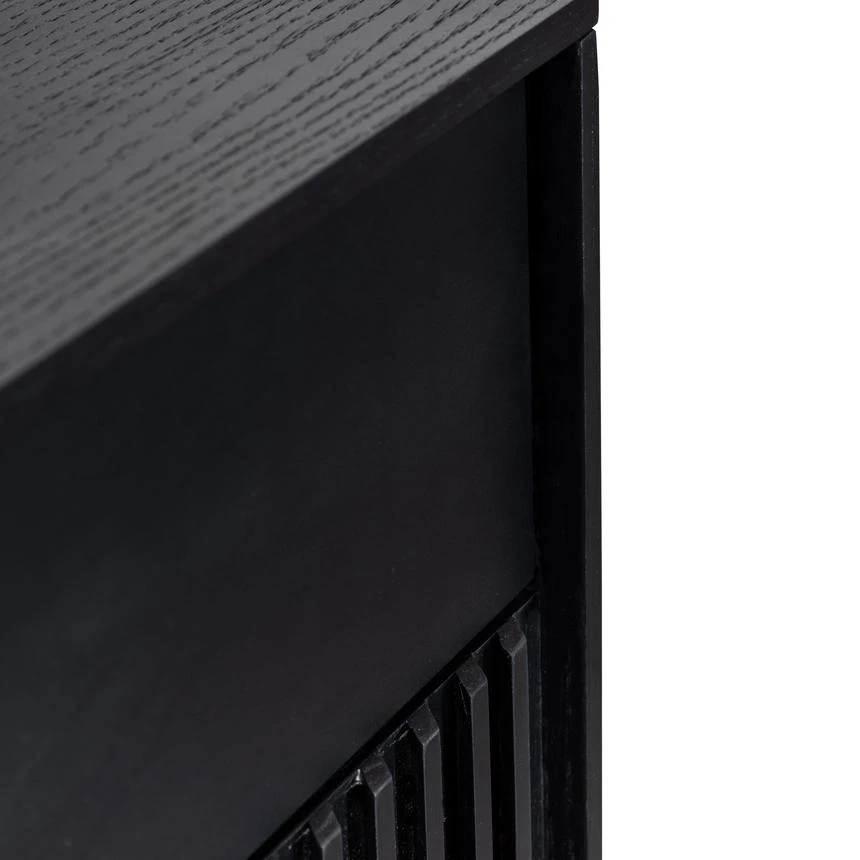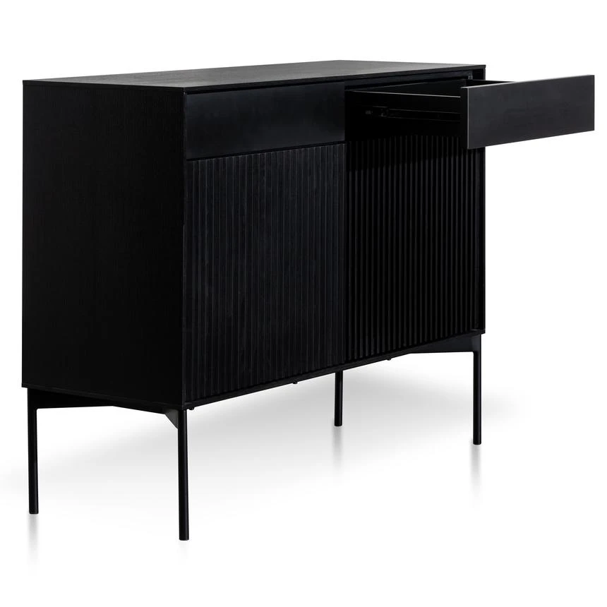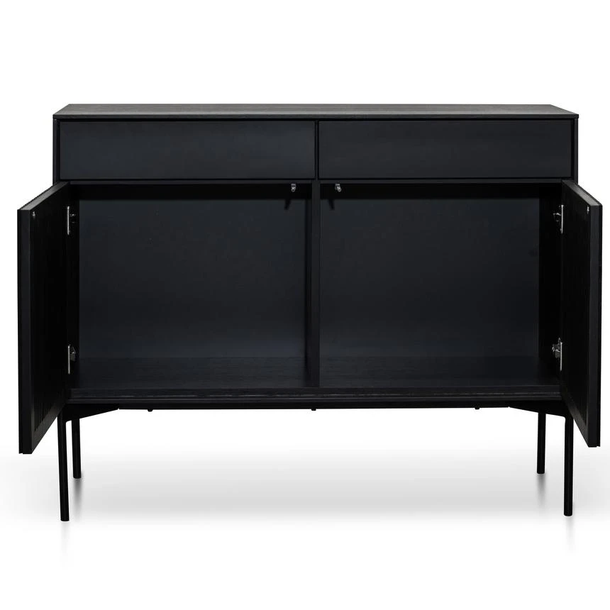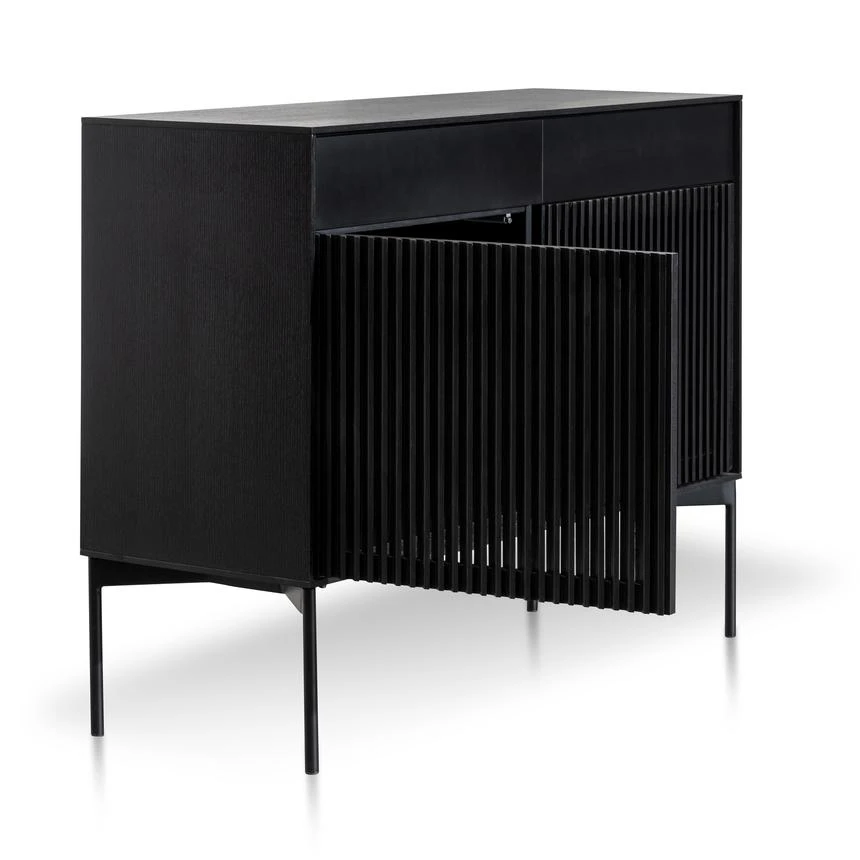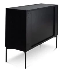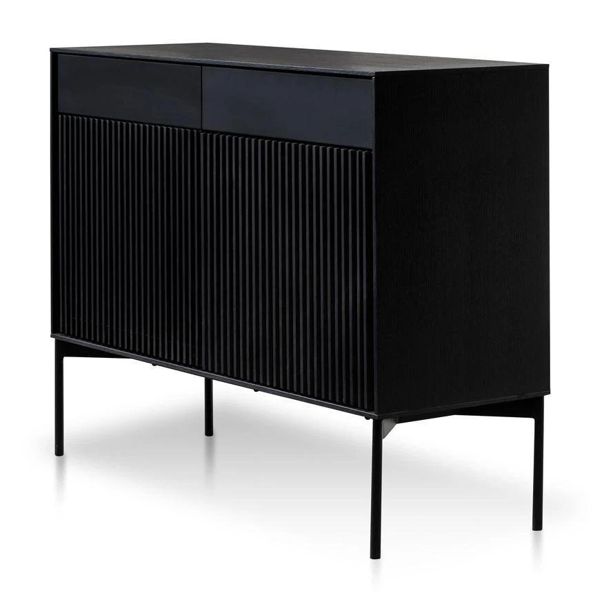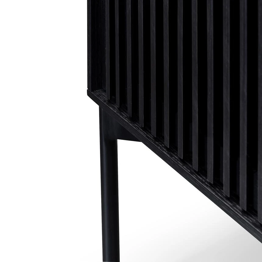 MDF and oak veneer construction Solid wood doors in a black finish Metal legs in a matte black finish 2 x drawers and 2 x cupboards Minor assembly required