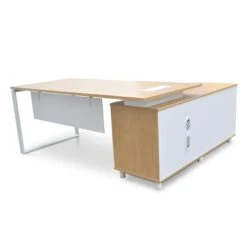 Natural timber veneer tabletop and return section body Steel base in a white finish Removable modesty panel 3 x lockable drawers, 1 x cupboard and a two-tiered shelf Available in left or right return Flat packed Note: 5- years manufacturer’s warranty against defects Commercial grade Two-person assembly with furniture experience and an electrical drill required