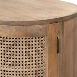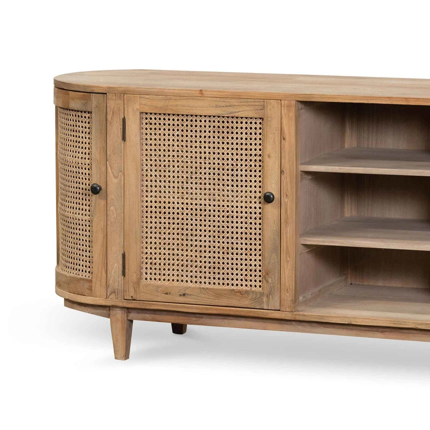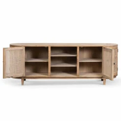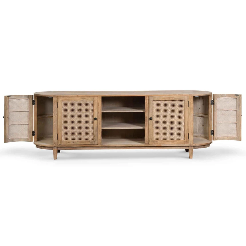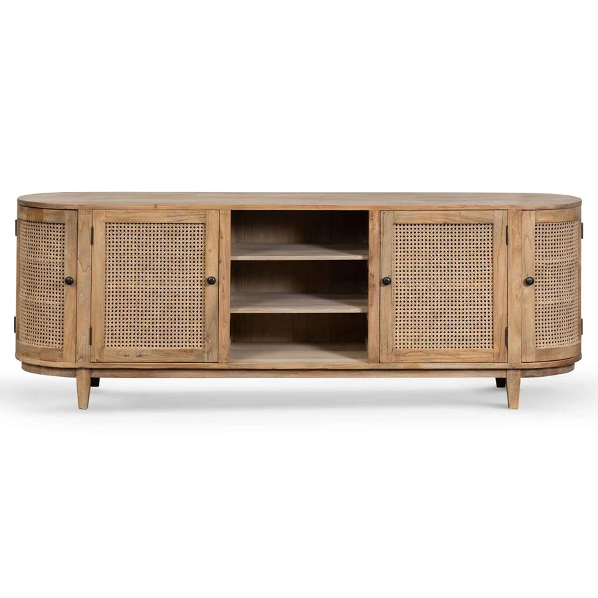 Recycled elm wood construction Upholstered in a woven rattan Door handles finished in a gunmetal grey 4x doors, 4x concealed shelves, 3x open shelves and 2x cupboards Product comes fully assembled Product Care: We highly recommend waxing often.