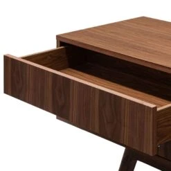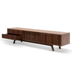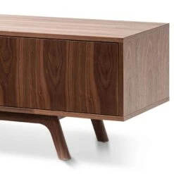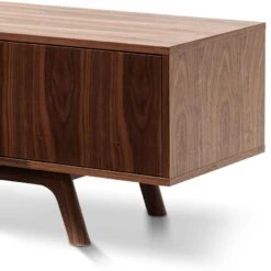 Durable construction from engineered wood with walnut veneer Sturdy symmetrical legs with flare detailing Wide and narrow form ideal for both compact and large-scale spaces Monochrome colour palette with visible wood grain textures and patterns Features 2x drawers, 2x sliding doors and 4x concealed shelves Includes 2x appliance hole for easy cable management Minor assembly required