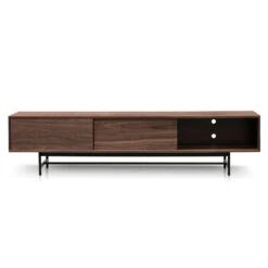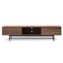 Features 3x doors on metal rails Durable MDF body with walnut veneer finish Powder black metal legs 6x appliance holes for easy cable management Contemporary style Notes: Due to the nature of timber and veneer, any variations of wood grain and colour are not inconsistencies and should be appreciated. Product is flat packed and requires two-man assembly As this product is flat-packed, please note that once the item has been partially or fully assembled, it will not be eligible for a change of mind return. Change of mind returns will only be accepted if the assembly has not been attempted and the item is in the original packaging.