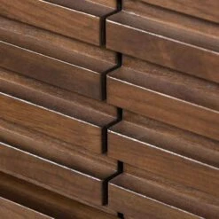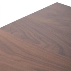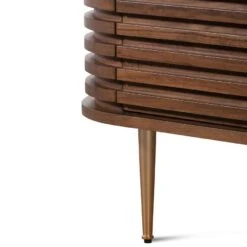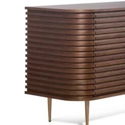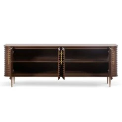 Engineered wood and walnut oak veneer Metal handles and base in a brushed gold finish Fluted buffet unit with rounded edges 4x push-to-open doors with concealed shelves Minor assembly required to attach legs and handles