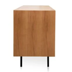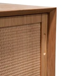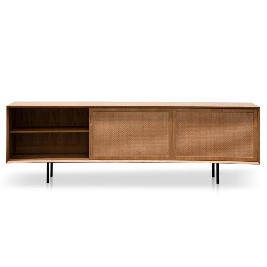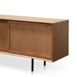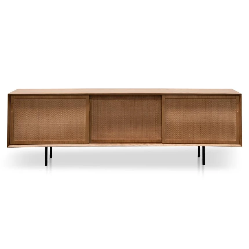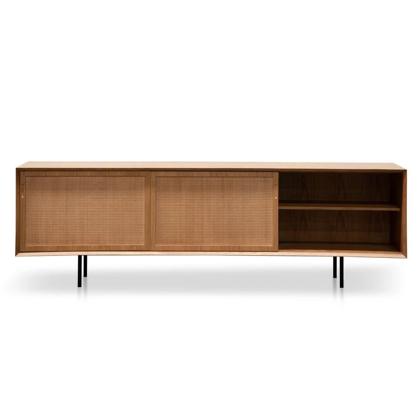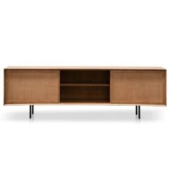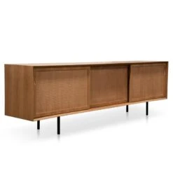 Features 3x slide doors with two-tiered shelving for storage Rattan doors add subtle texture for visual interest Durable oak wood with a natural finish Strong steel legs in a black powder coat finish Note: Product requires two-person assembly and furniture assembly experience.