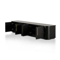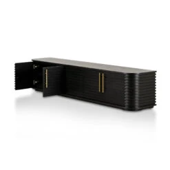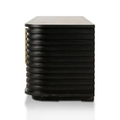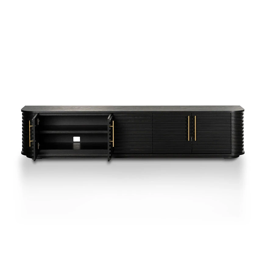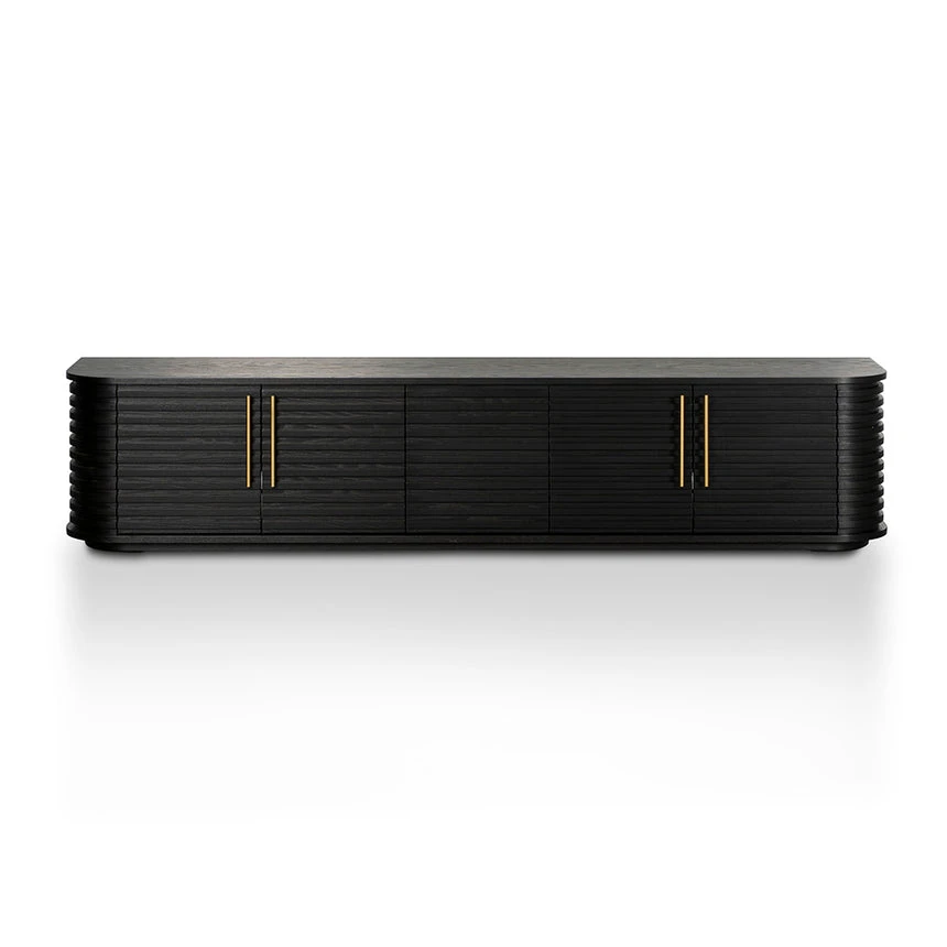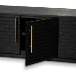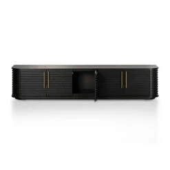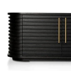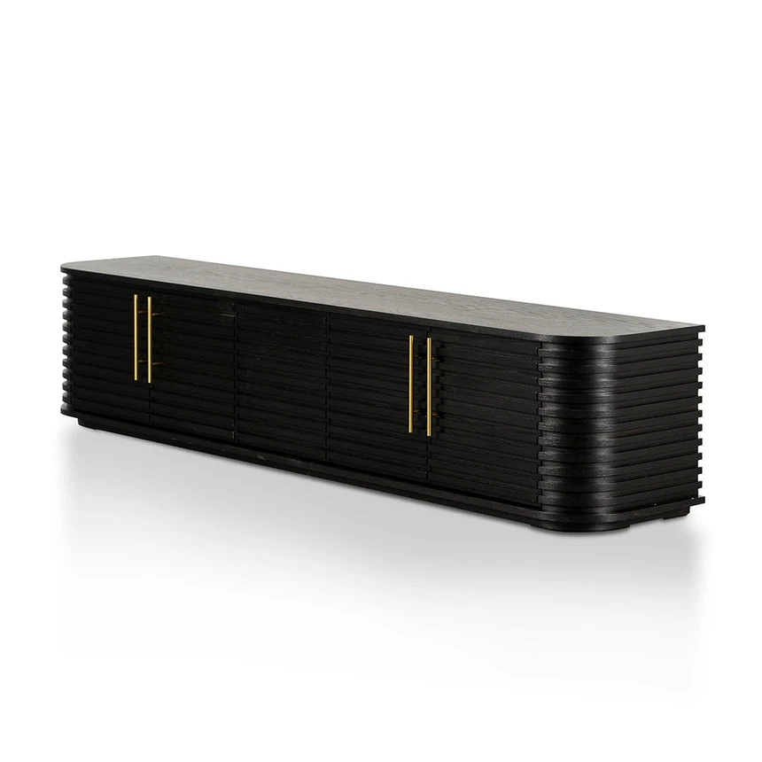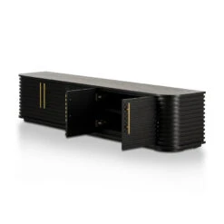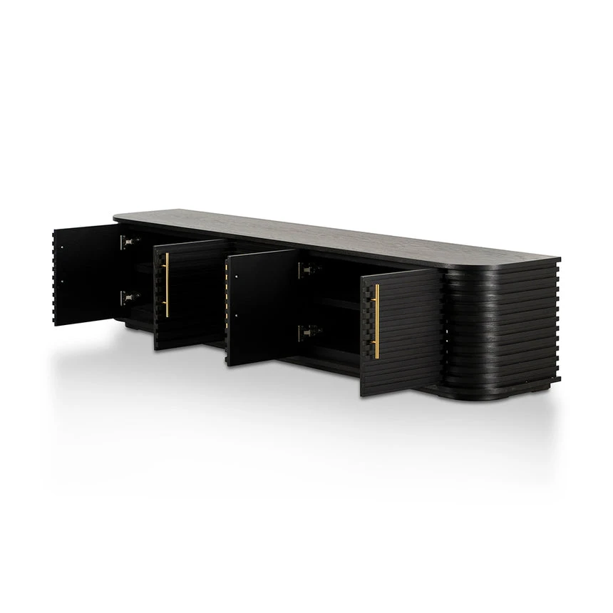 Engineered wood with oak veneer Textured espresso black finish with NC lacquer Features horizontal wooden slat 4x doors with brass handles Includes 2x cable management holes Product is fully assembled