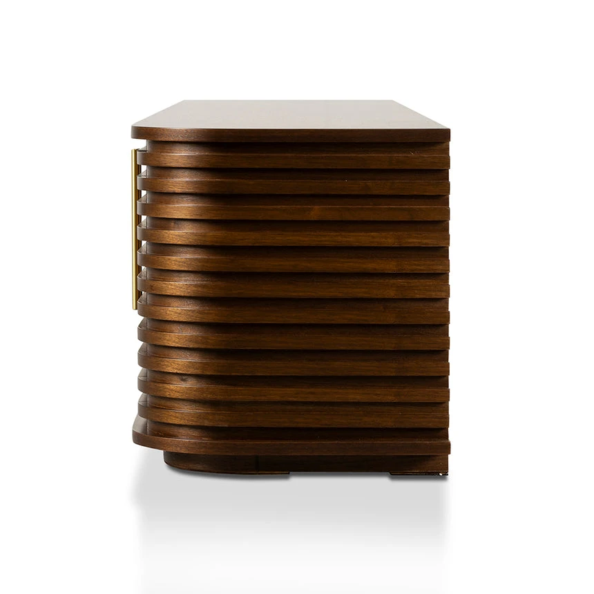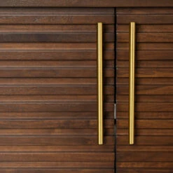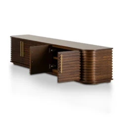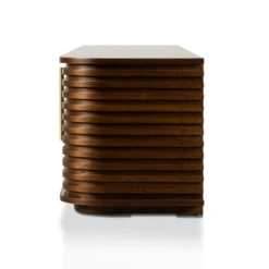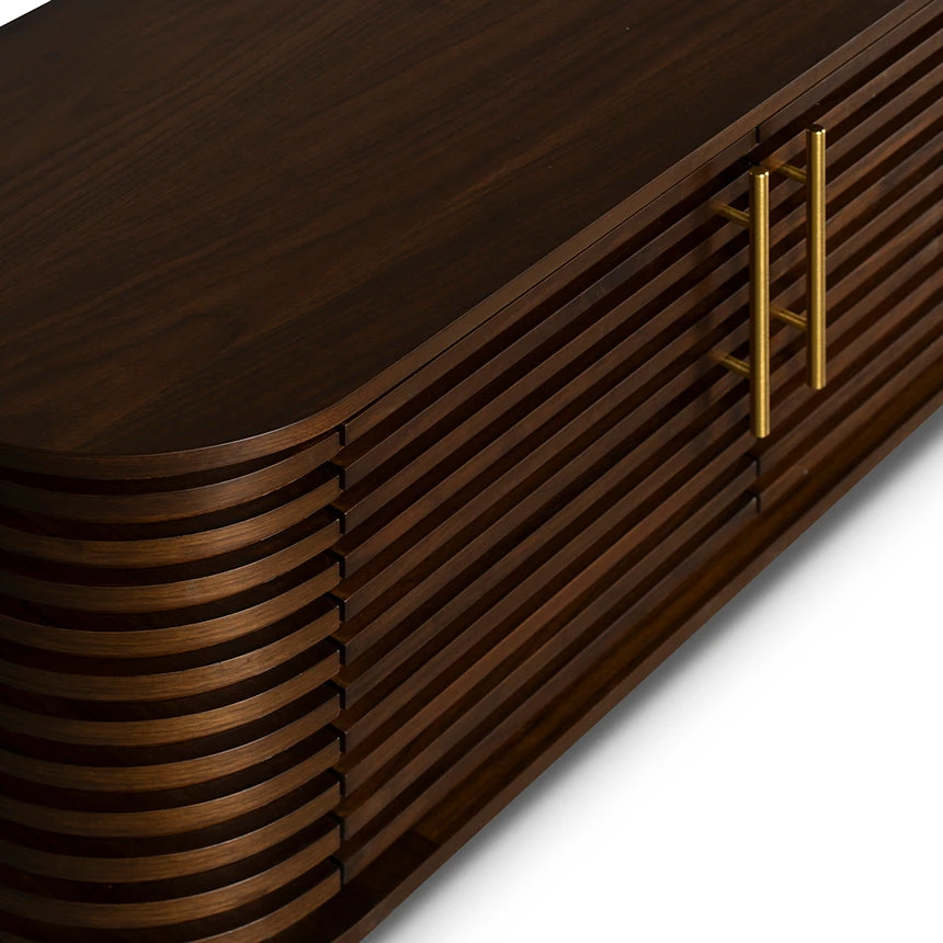 Engineered wood with oak veneer Walnut finish with NC lacquer Features horizontal wooden slat 4x doors with brass handles Includes 2x cable management holes Product is fully assembled