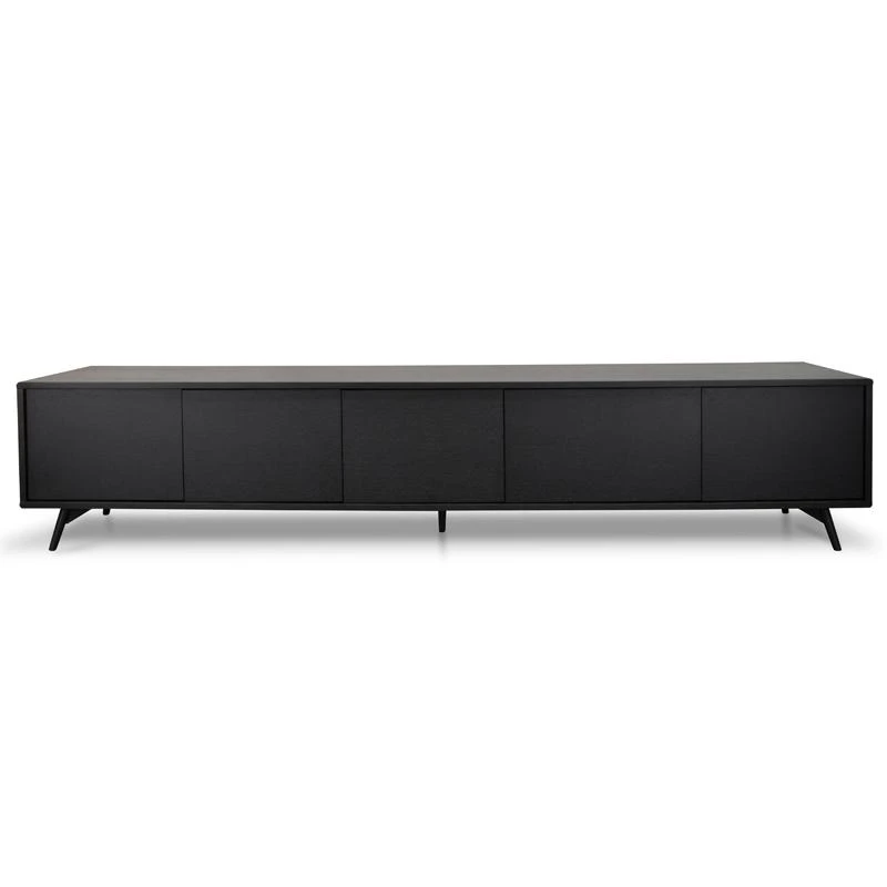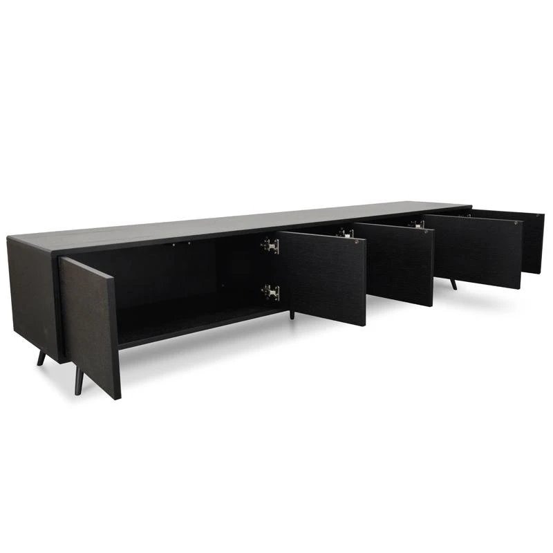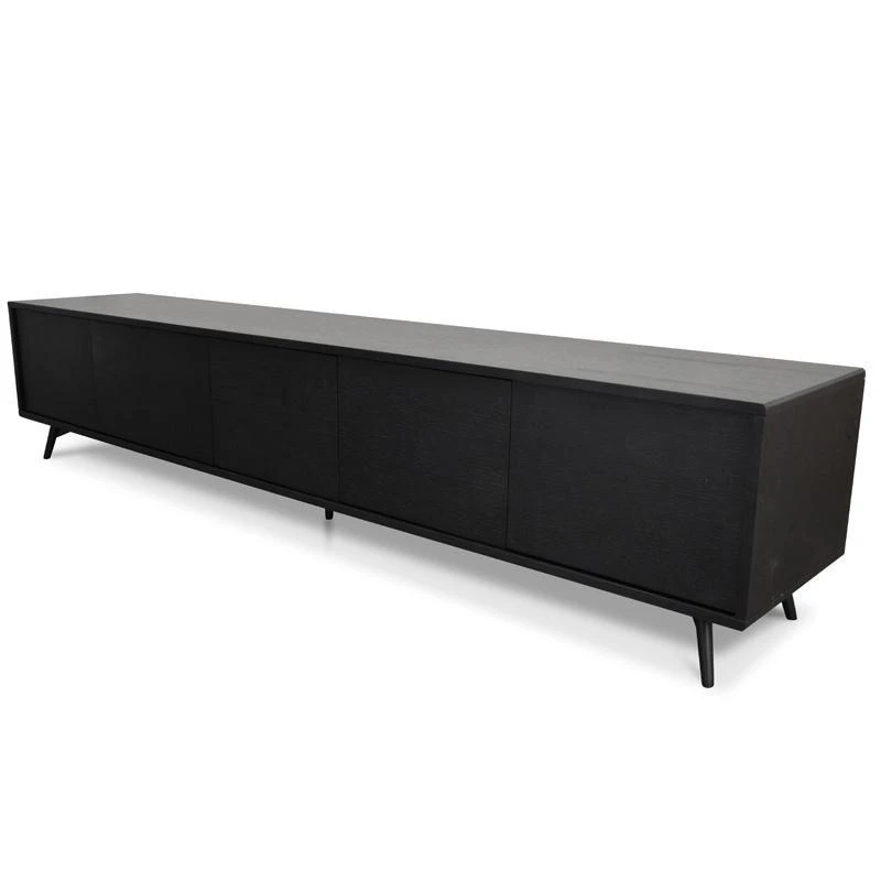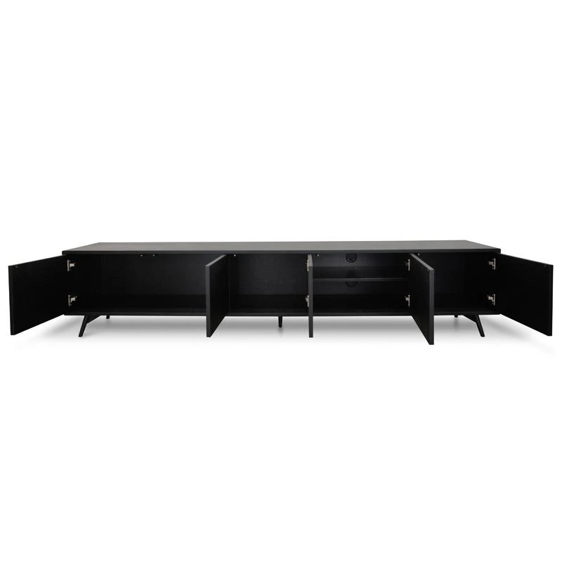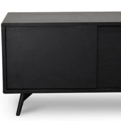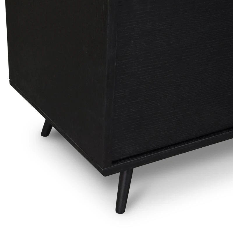 Five push-in doors open up to 2x cupboards, 1x large cupboard, and 1x compartment with two-tier shelving Natural oak wood body in a black finish balanced with the flared legs for a balanced design Strong black metal legs provide lasting and stable support Additional 2x holes in back for cable management Product requires two man assembly and furniture assembly experience