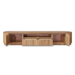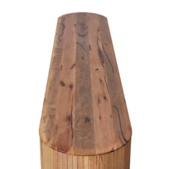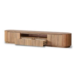 Oval Solid Marri top Engineered wood doors and drawers with Marri veneer Curved front corners Vertical slat design Push-to-open door mechanism 1 compartment, 2 drawers, 2 cabinets 1 appliance hole for cables Weight Capacity: 100 kg Product comes fully assembled