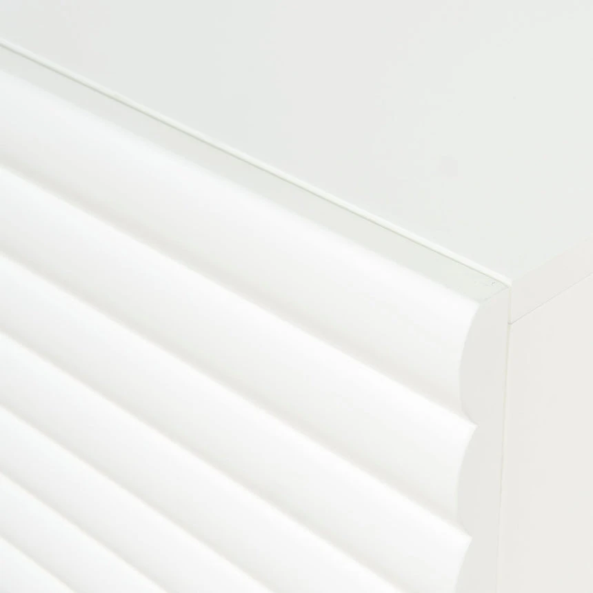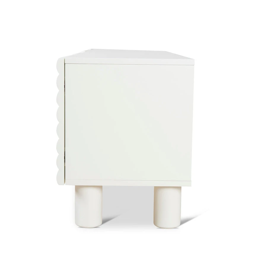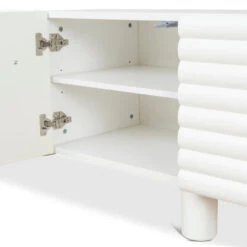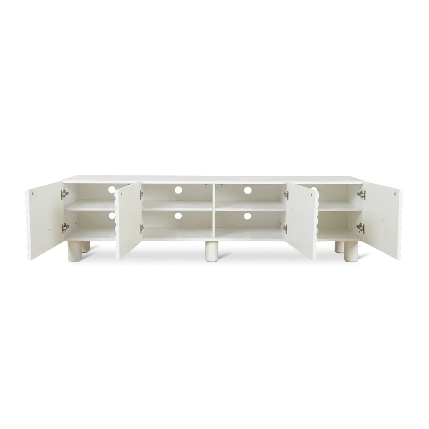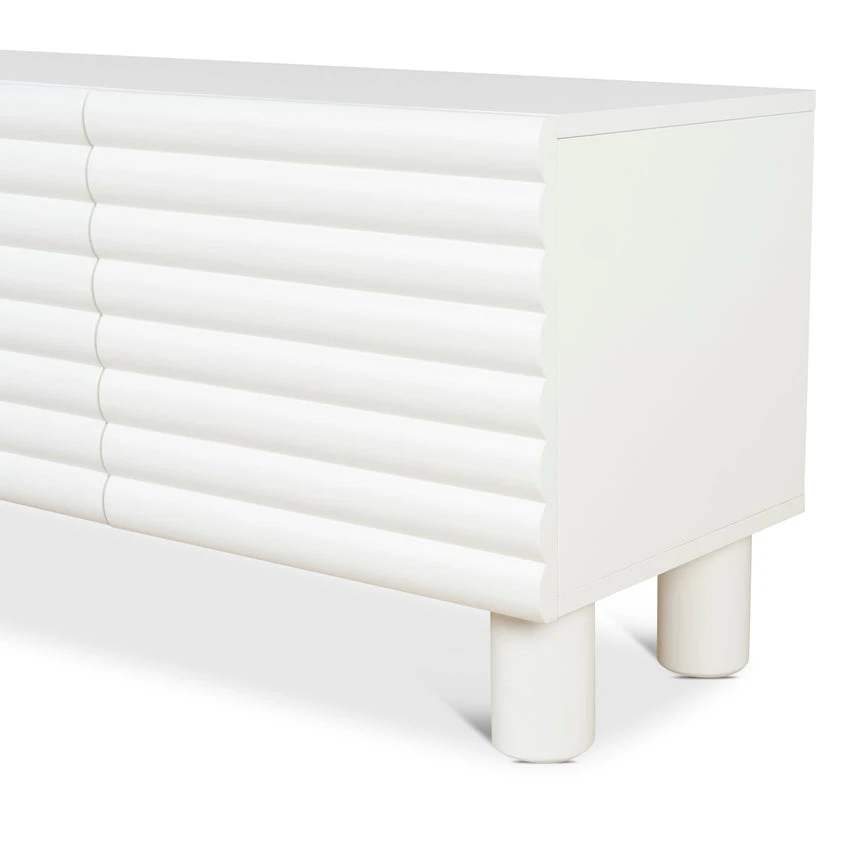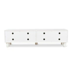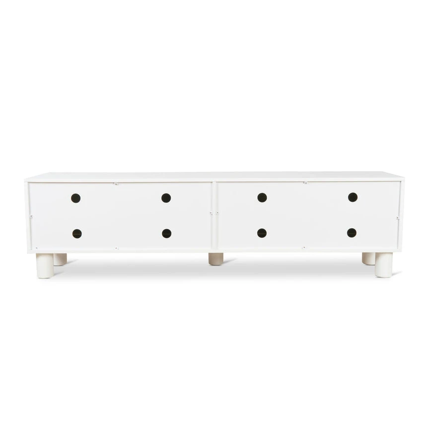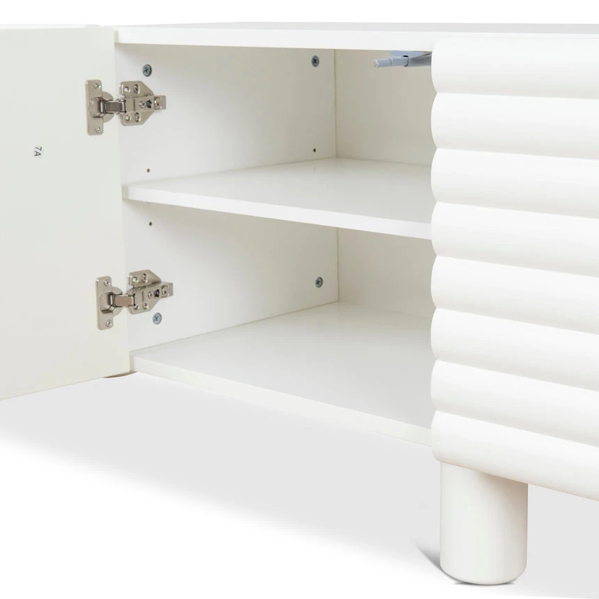 Engineered wood cabinet Solid beech wood legs 80% engineered wood, 20% solid oak Multiple shelves for storage Cable management holes Clean fluted front panel design Chunky rounded legs Product is flat packed and requires two-person assembly
