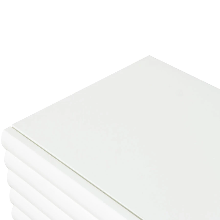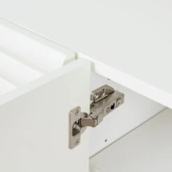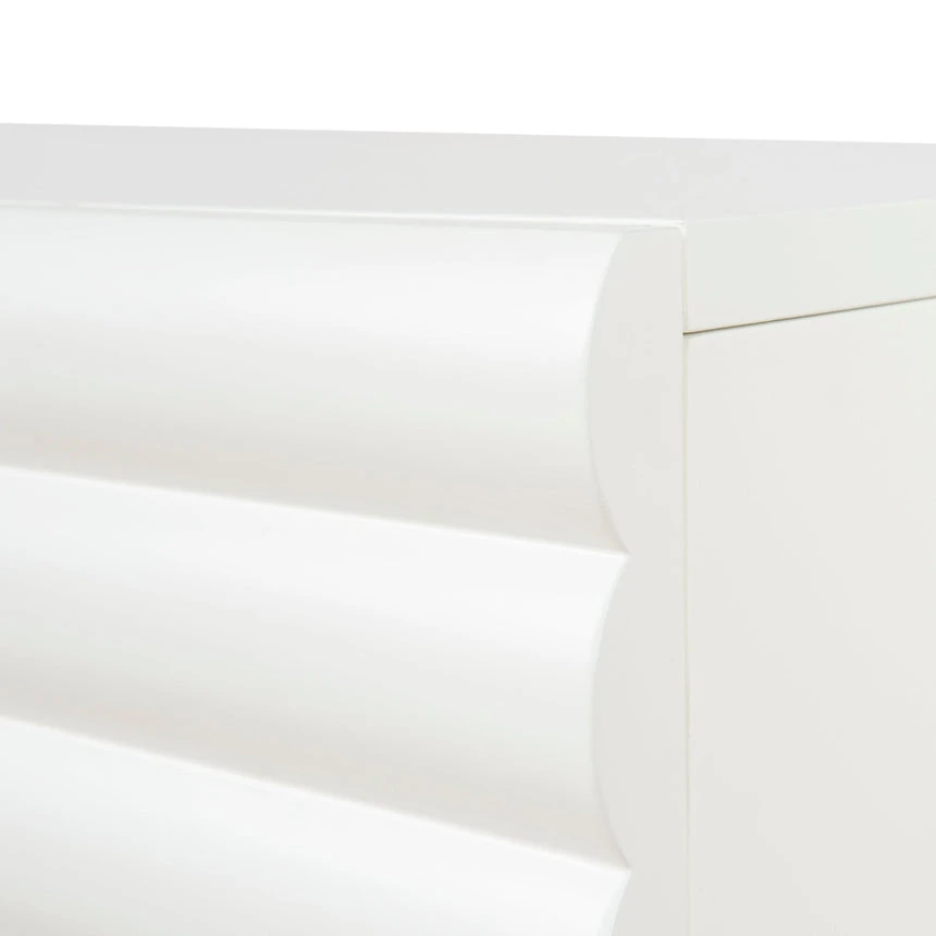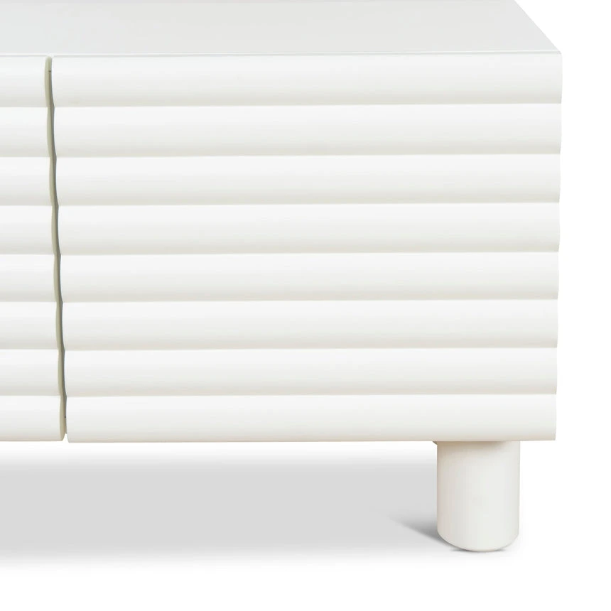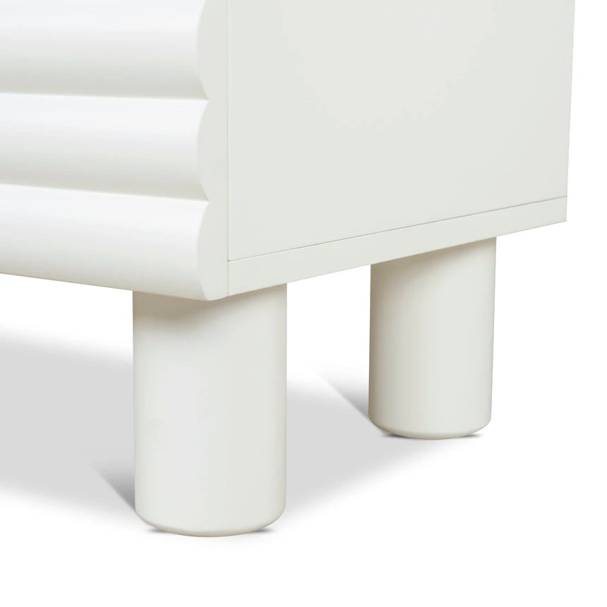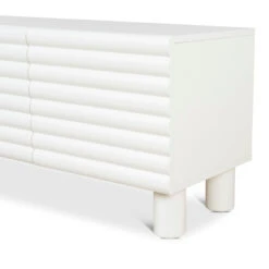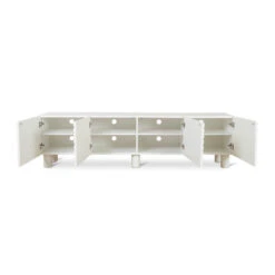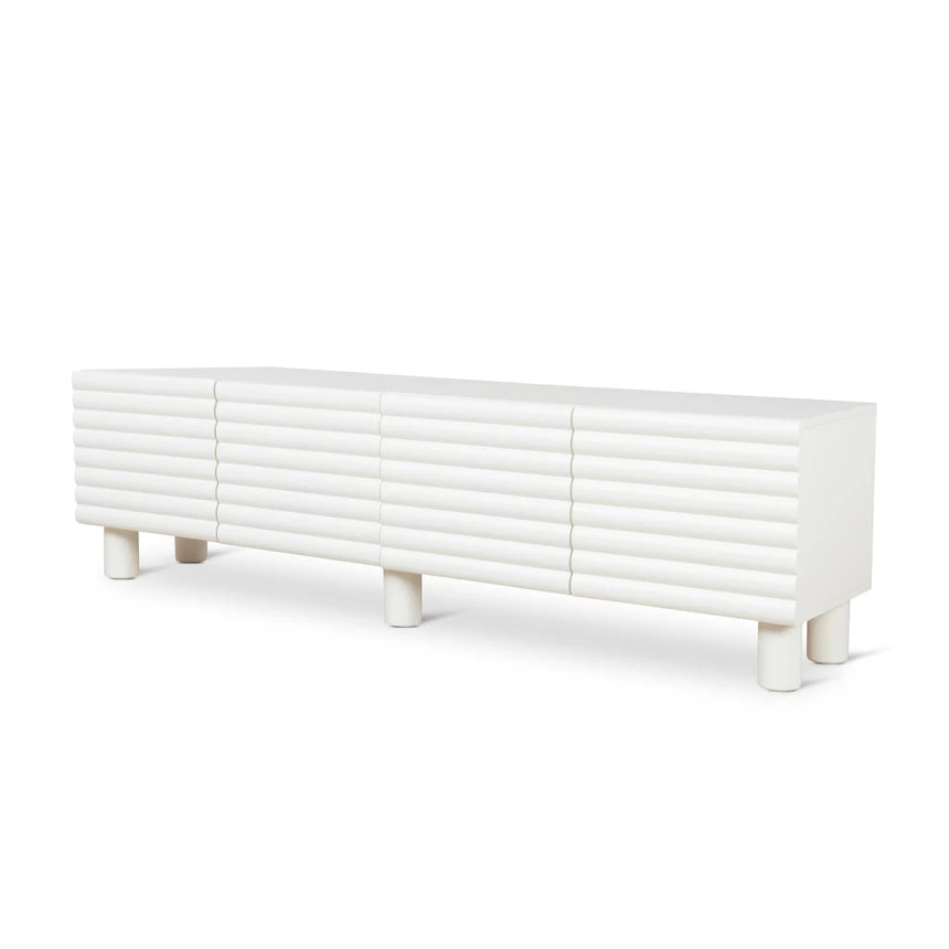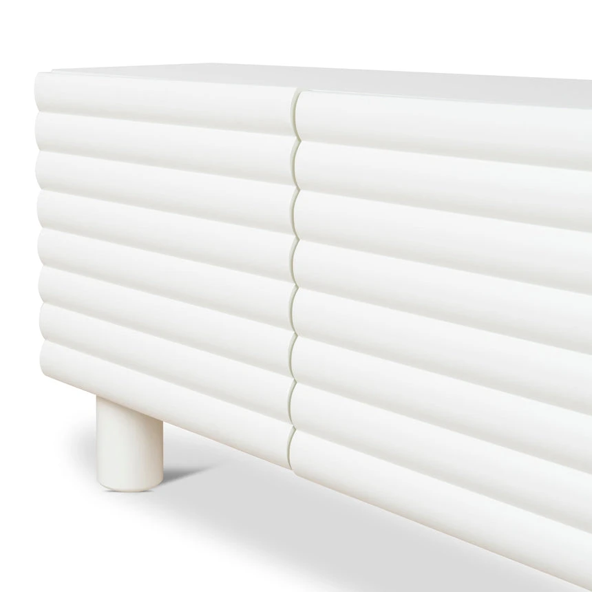 Engineered wood cabinet Solid beech wood legs 80% engineered wood, 20% solid oak Multiple shelves for storage Cable management holes Clean fluted front panel design Chunky rounded legs Product is flat packed and requires two-person assembly