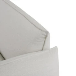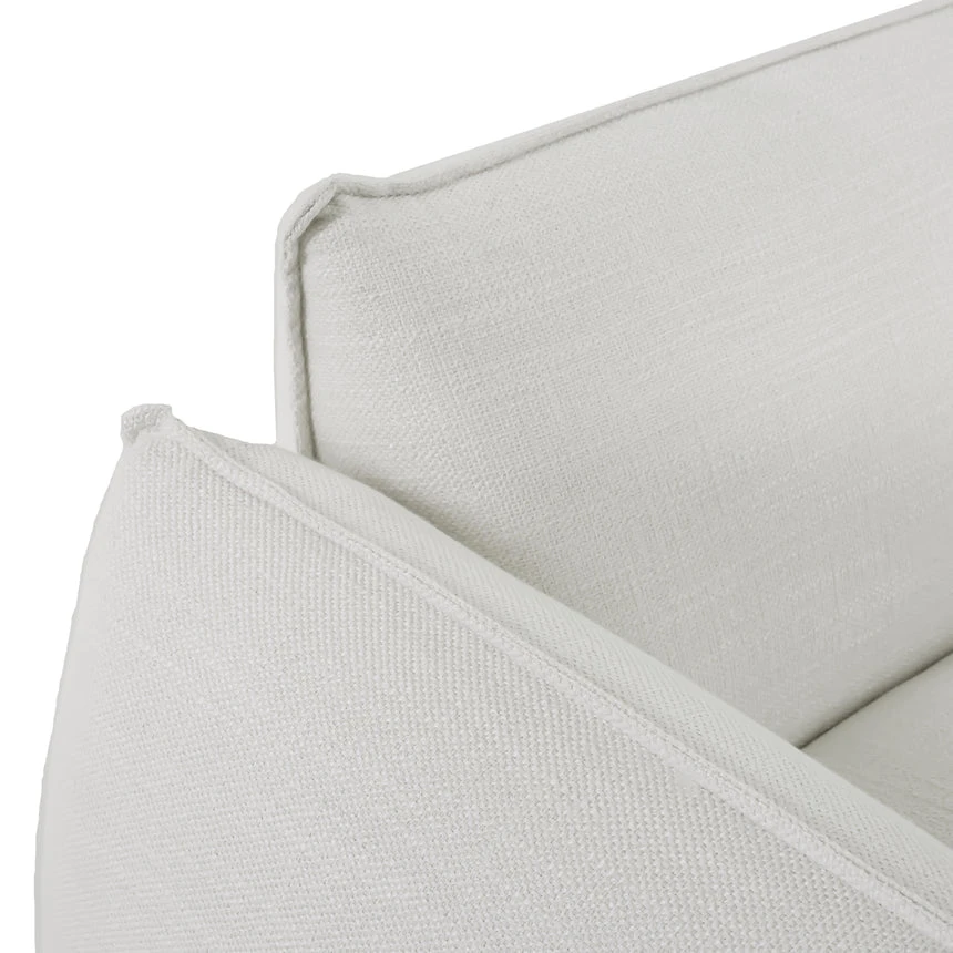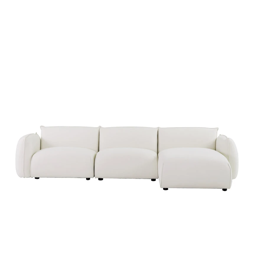 95% polyester, 5% nylon upholstery Plywood frame construction Foam with cotton silk floss Rubber wood legs in black powder coat Beige finish with plush cushion Right chaise sofa design Soft-medium seat firmness Weight capacity: 350 kg Minor assembly required