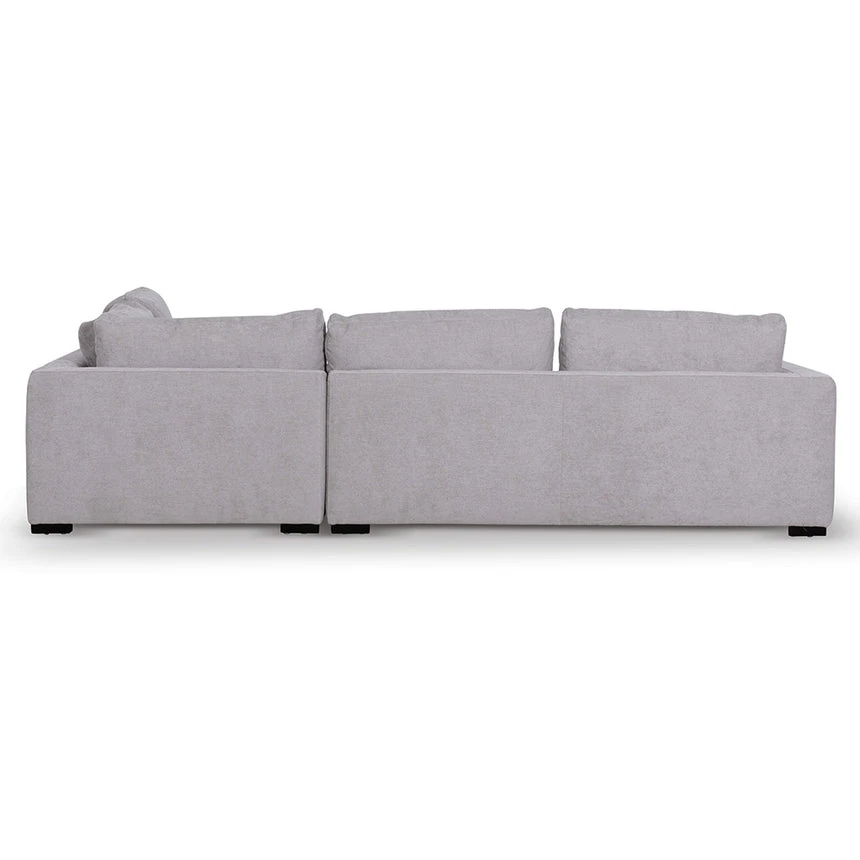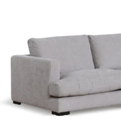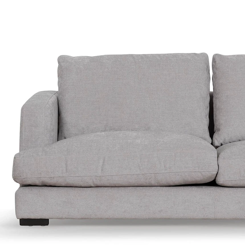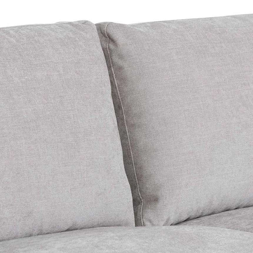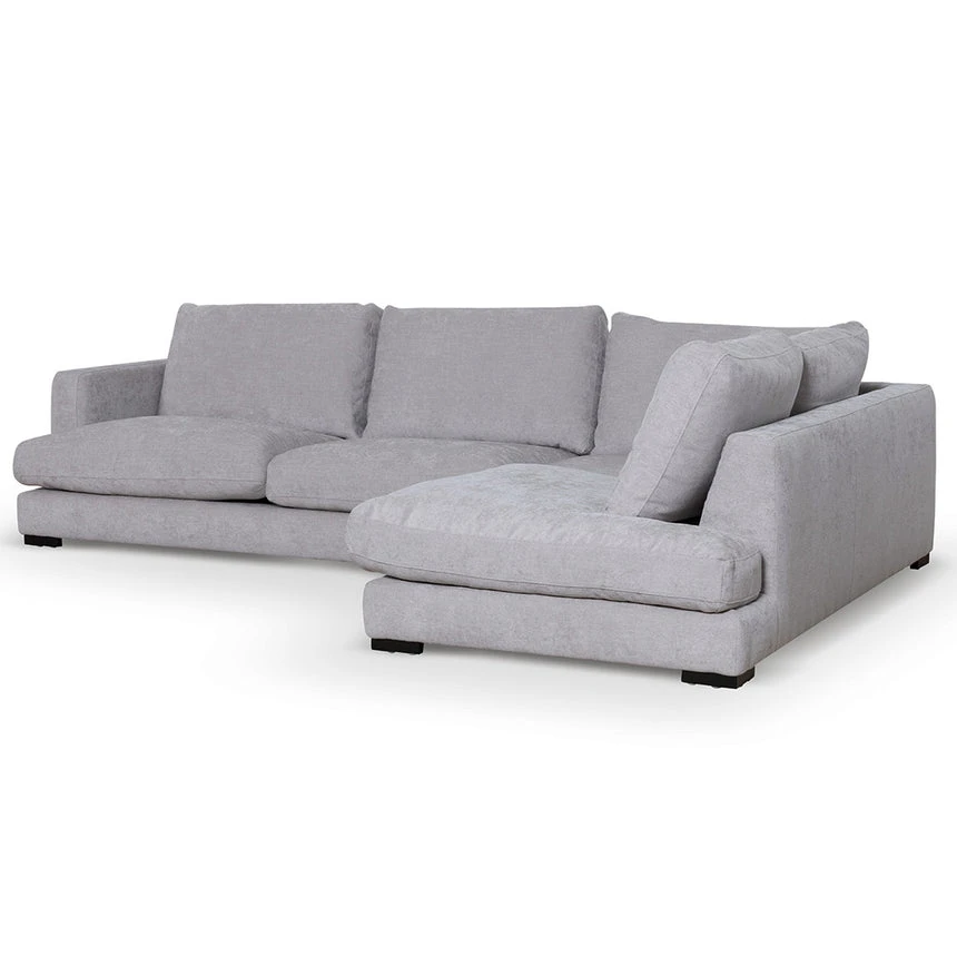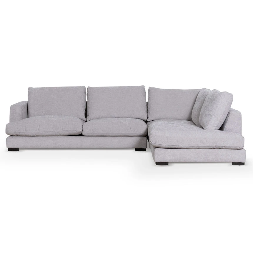 Upholstered in a 100% oyster beige polyester fabric Frame in a timber wood construction Back and seat rest with a foam and polyester fibre filling Web and spring suspension for lasting integrity Square and compact legs in a polypropylene build Wide, spacious low-line design with right chaise Soft-medium seating firmness Product comes fully assembled