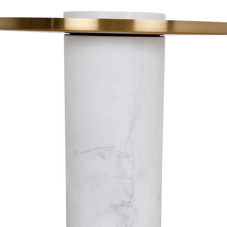 Real marble top Brushed gold finish Round design Smooth sophisticated surface Elegant modern style Ideal for contemporary interiors Weight Capacity: 5 kg Minor Assembly Required