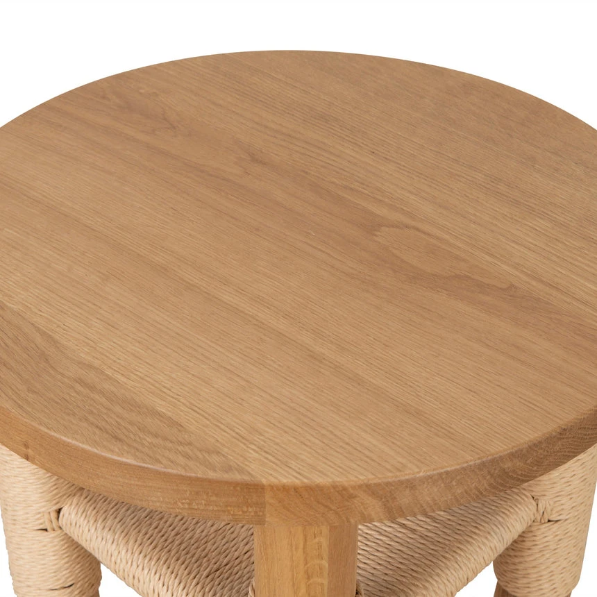 American white oak frame Natural finish Solid timber with woven cord seat Timber legs Handwoven rope accents Minimalist circular top Weight Capacity: 10 kg Product comes fully assembled