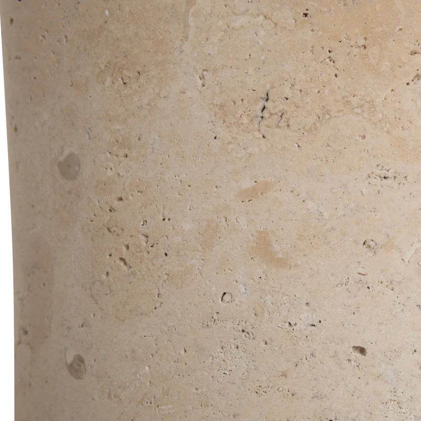 Travertine marble frame Brushed gold stainless steel top Modern luxurious design Ideal for living or lounge areas Cylindrical base with textured dark marble Modern and classic aesthetics Weight Capacity: 5 kg Minor Assembly Required
