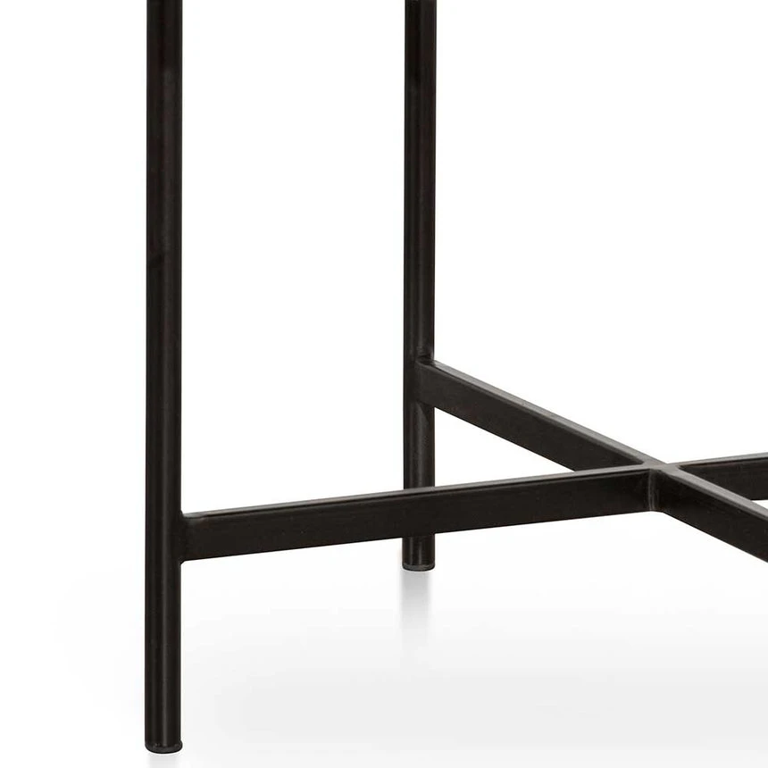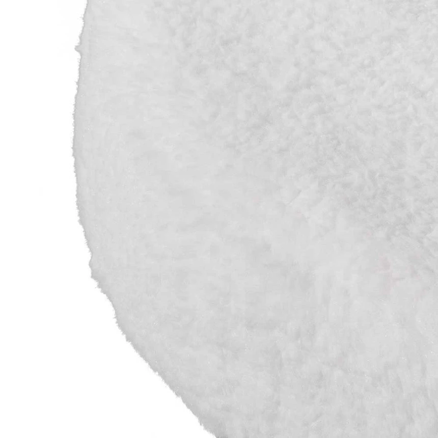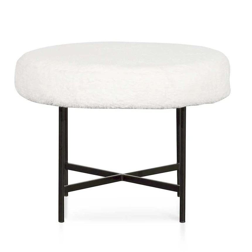 Upholstered in an all-white faux fur Base is an iron build with a matte black finish Legs feature an intersecting x-shaped base Weight capacity of 200kg 2-year warranty Product comes fully assembled