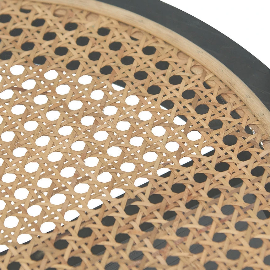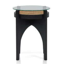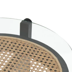 Solid elm wood structure finished in matte black Clear round tempered glass table top Natural rattan woven shelf under the glass Cross-arched design with four legs Product is fully assembled