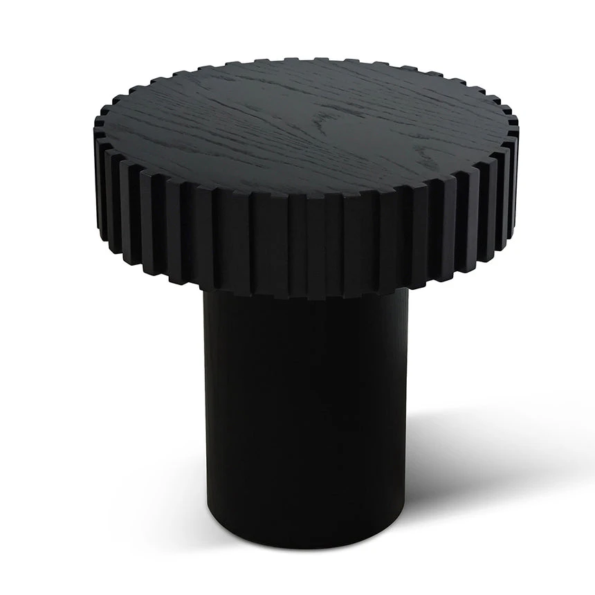 Durable engineered wood with veneer construction Full black finish with water-based paint Circular top with vertical wood panel design Visible wood grain patterns Cylinder-legs design Minor assembly required