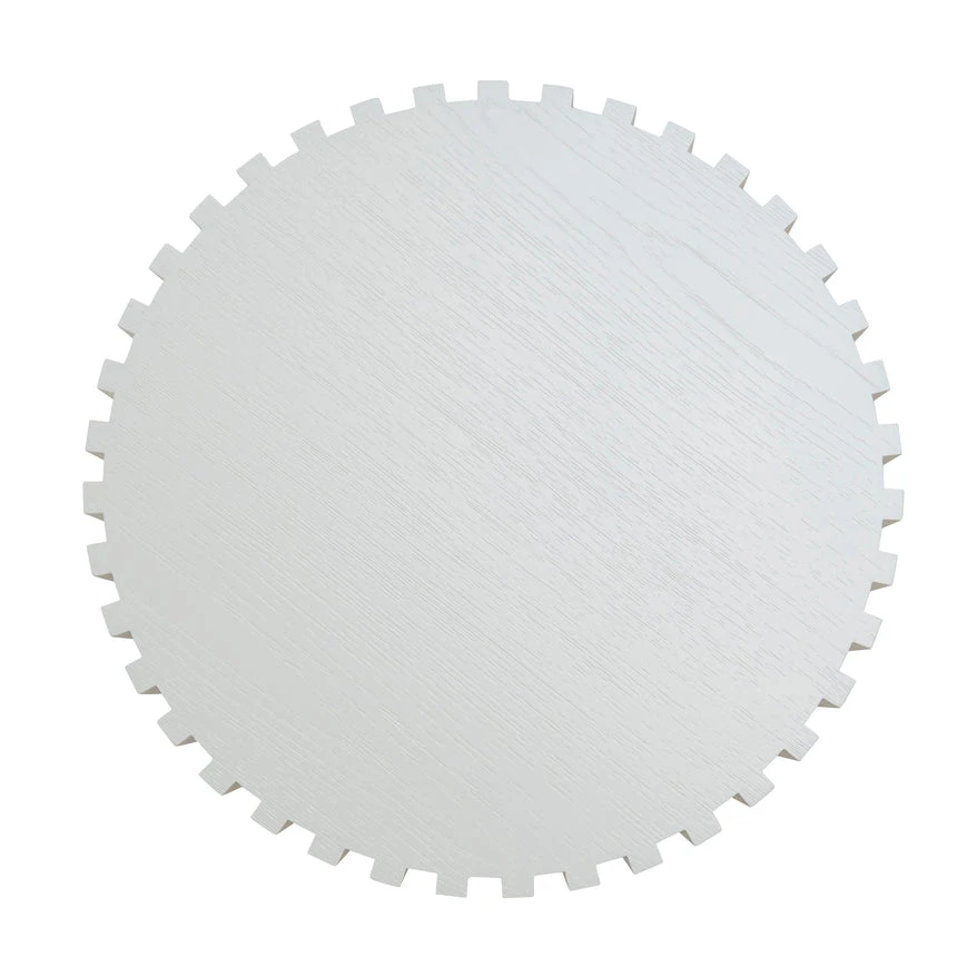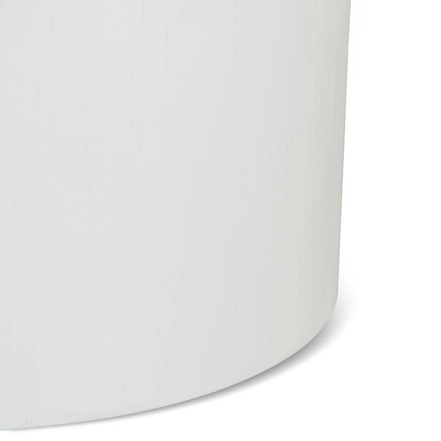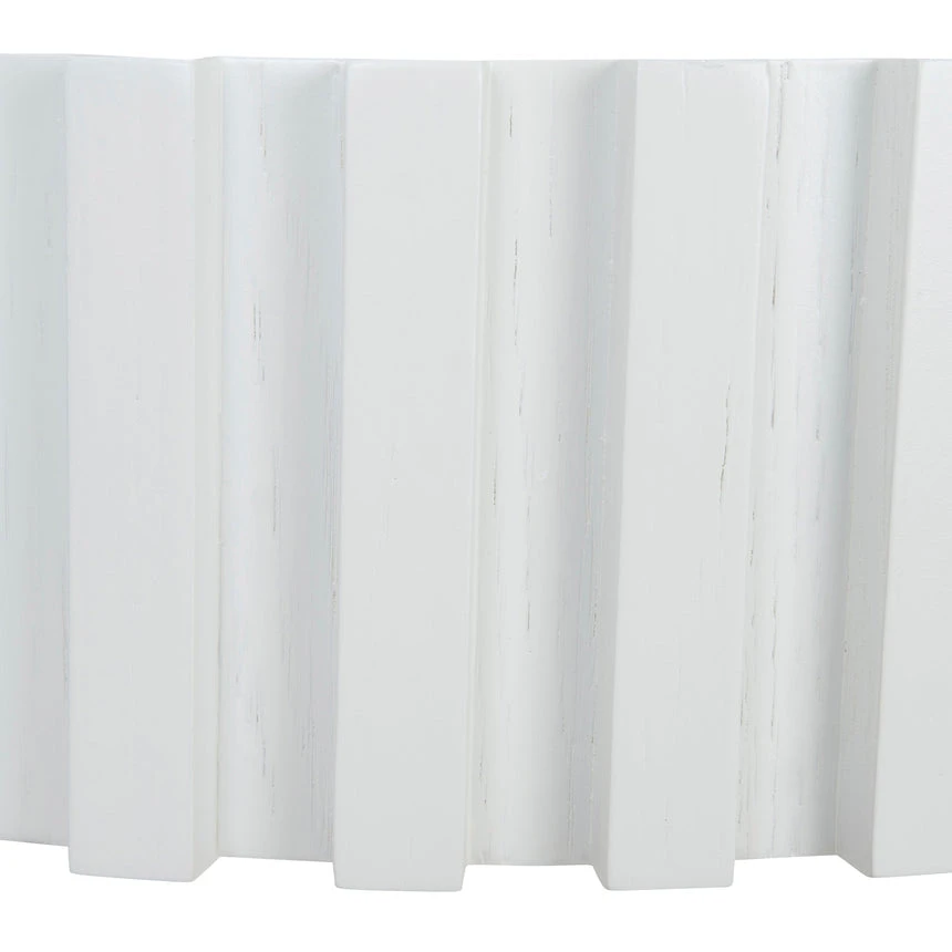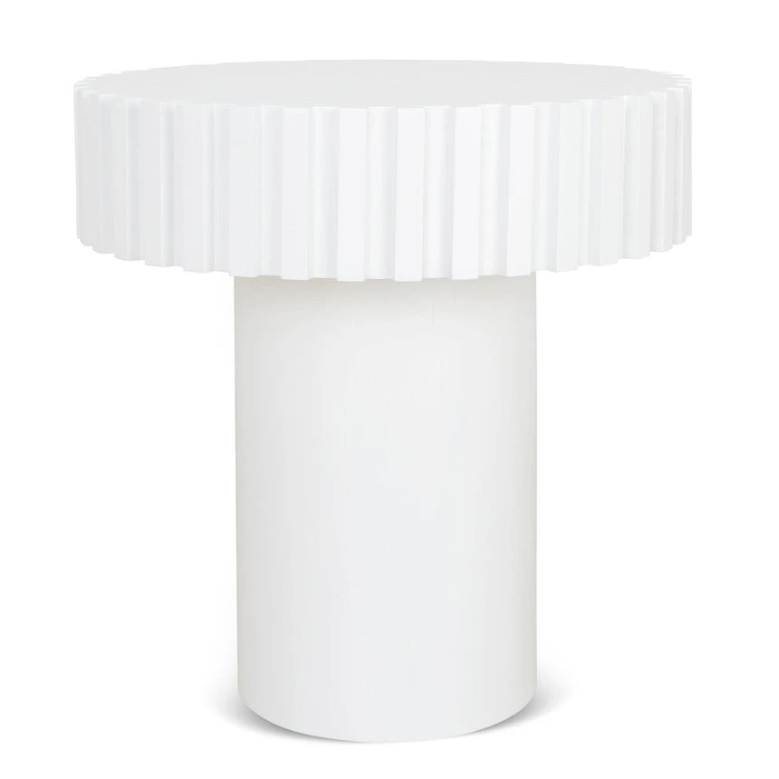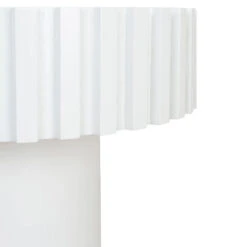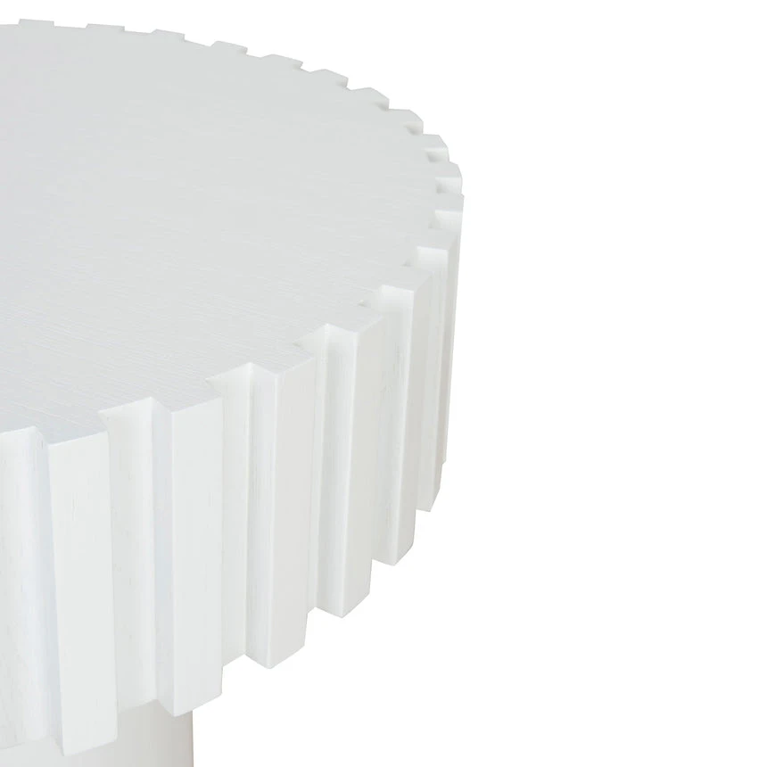 Engineered wood with veneer Water-based paint Full white finish Cylindrical base with circular tabletop Modern design Ribbed texture top Ideal for minimalist aesthetics Weight Capacity: 10 kg Minor assembly required