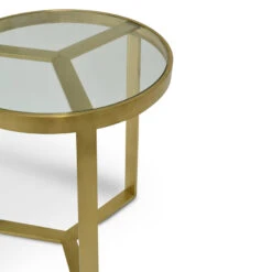td {border: 1px solid #ccc;}br {mso-data-placement:same-cell;}--> Round clear glass top offers additional surface space for styling Strong stainless steel base and legs in a brushed gold finish Compact size to fit tight spaces or to accent existing furnishings Balanced and minimalist geometric-inspired frame