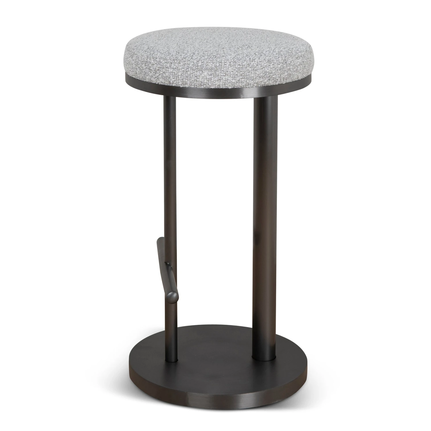 Silver grey polyester boucle Stainless steel construction Brushed gold finish Backless circular foam seat Footrest for comfort Pedestal base Weight Capacity: 100 kg Product comes fully assembled