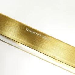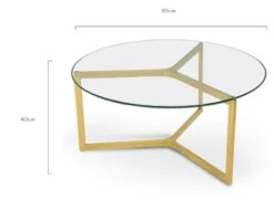 Round clear tempered glass table top Strong stainless steel legs and flat frame in a brushed gold finish Angular frame design creates a simple geometric interest Feet protectors included preventing slipping and scuffing Suction cups included to secure the table top and frame