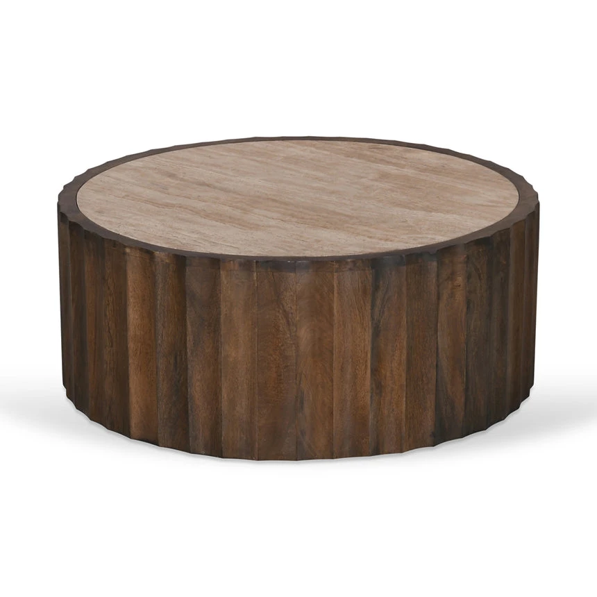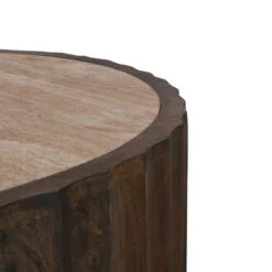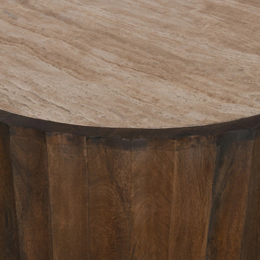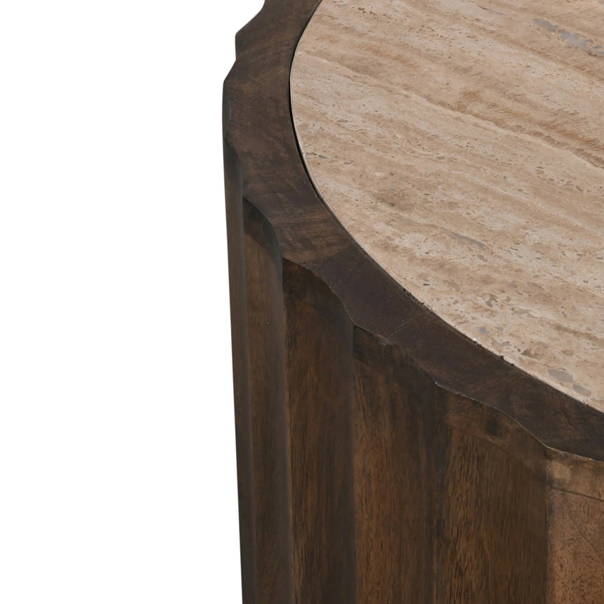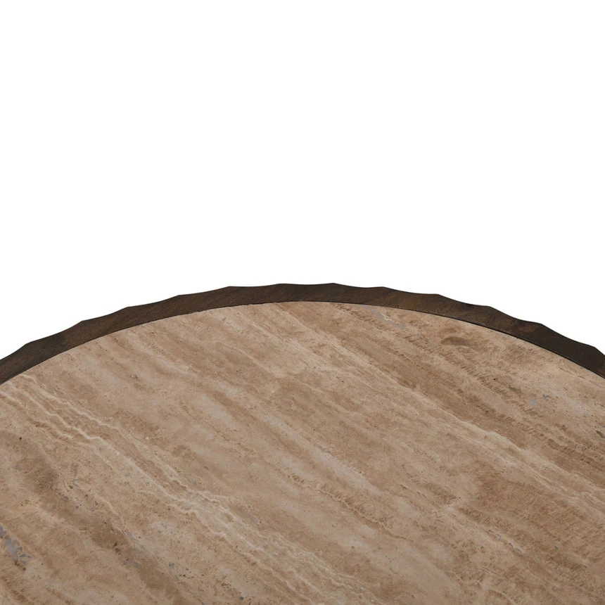 Marvel travertine tabletop Walnut-wrapped base Curved wood patterns Mango wood base Top surface for displays Weight Capacity: 25 kg Product comes fully assembled Note: Melbourne Pick-up and Delivery Only Travertine marble is a natural stone which will have unique imperfections and characteristics Any variations in colour, texture, polish and patterns are not faults Travertine marble is porous; wipe away any liquid spills immediately using water or a mild cleaner to avoid marks. Placemats and coasters are recommended Differences between shipments is to be expected